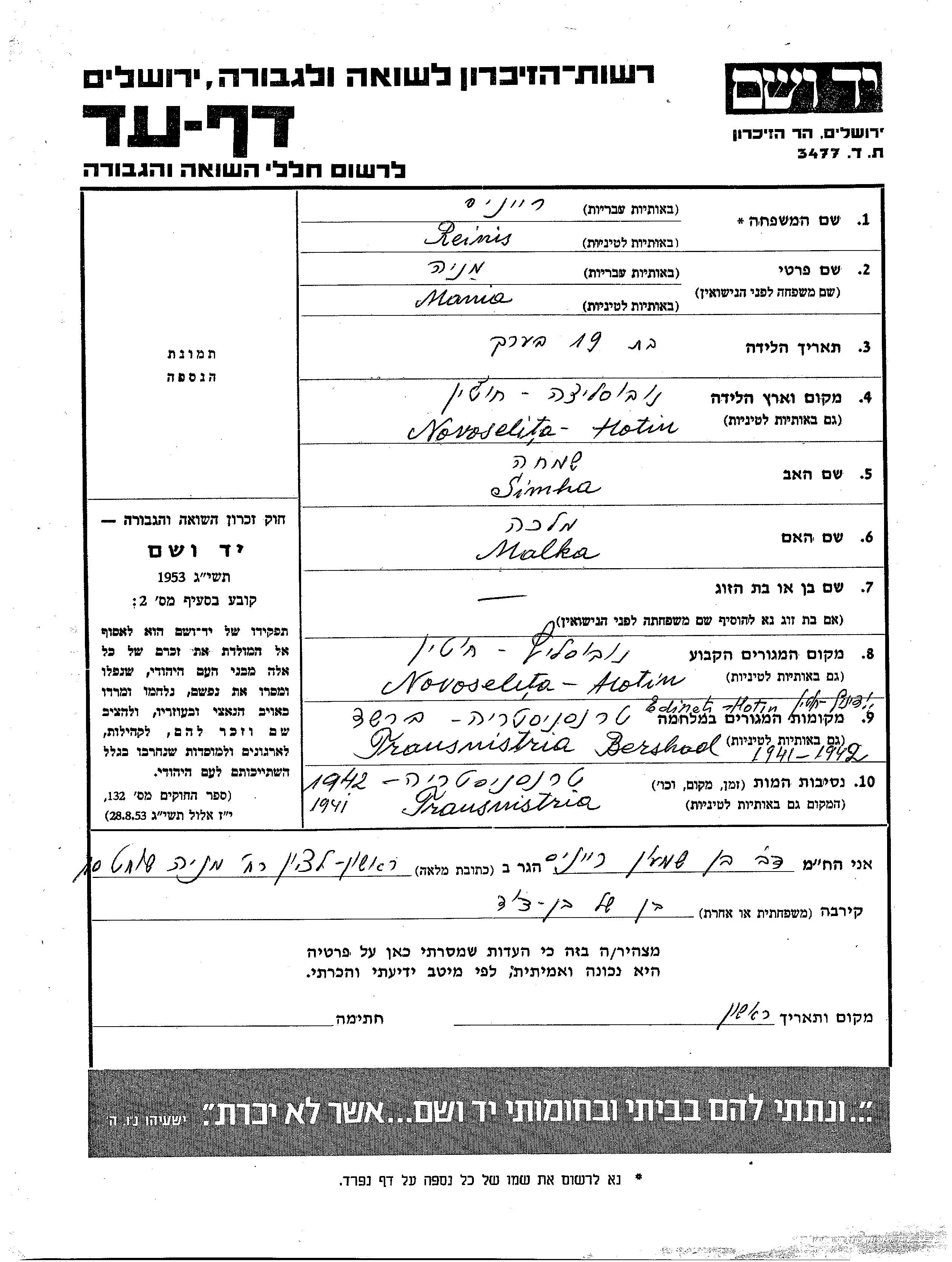 Mania Reinis wurde im Jahr 1923 in Sulita, Rumänien geboren. Sie war Schüler/-in. Vor dem Zweiten Weltkrieg lebte sie in Sulita, Rumänien.