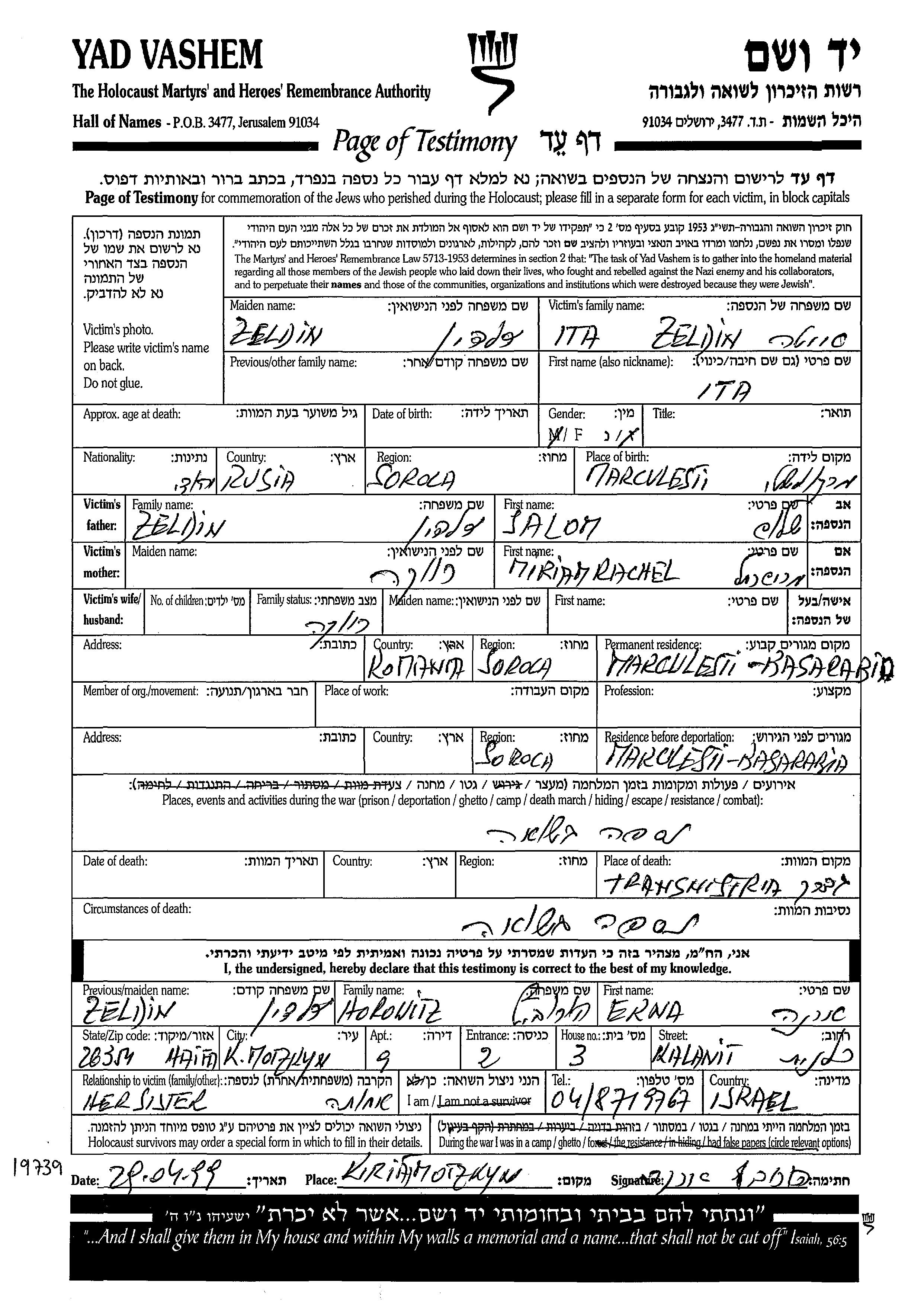 Ita Sukherman Zeldin, geb. Zeldin wurde im Jahr 1905 in Marculesti, Rumänien geboren. Sie war Hausfrau. Vor dem Zweiten Weltkrieg lebte sie in Marculesti, Rumänien.