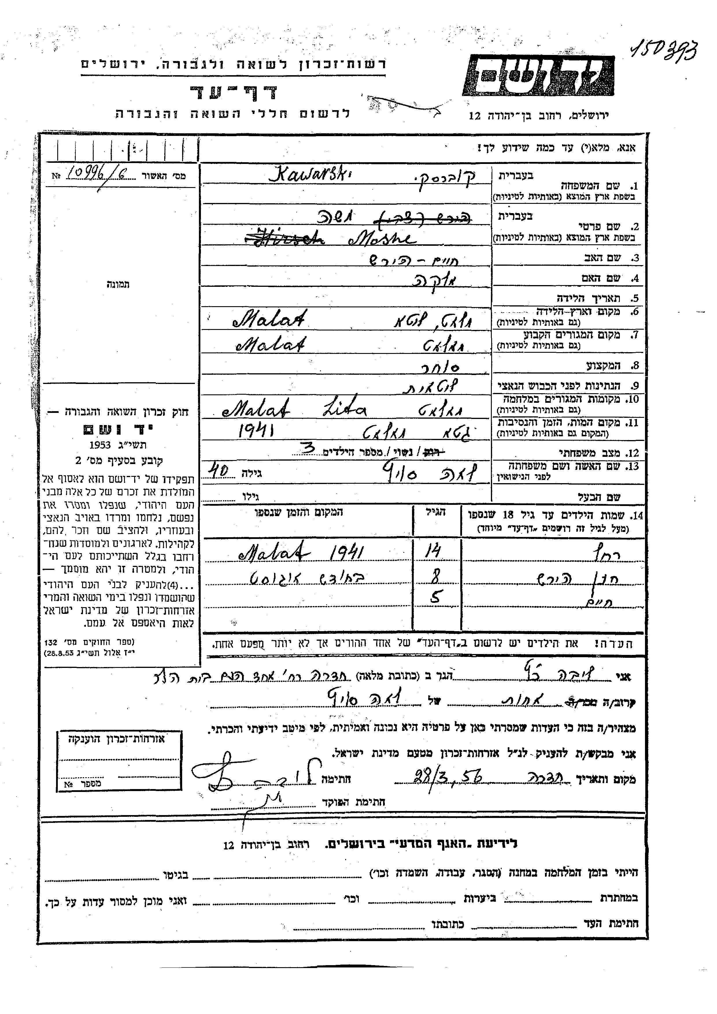 Kawarski Kovarski Rakhel Malat, Litauen Gedenkblatt