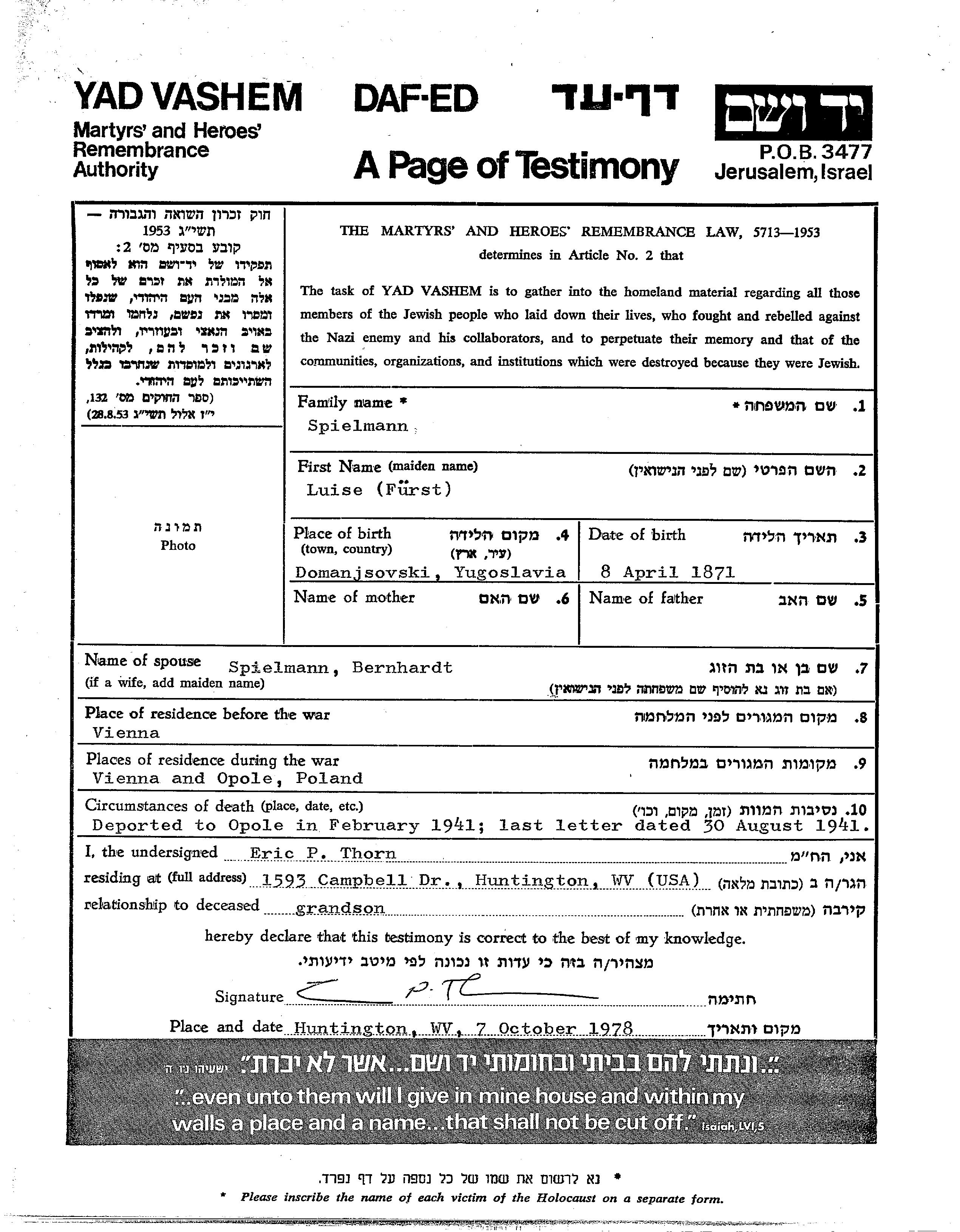 Luise Spielmann, geb. Fürst wurde im Jahr 1871 in Domanjsevci, Jugoslawien geboren. Sie war Gefreiter. Vor dem Zweiten Weltkrieg lebte sie in Vienna, Österreich.