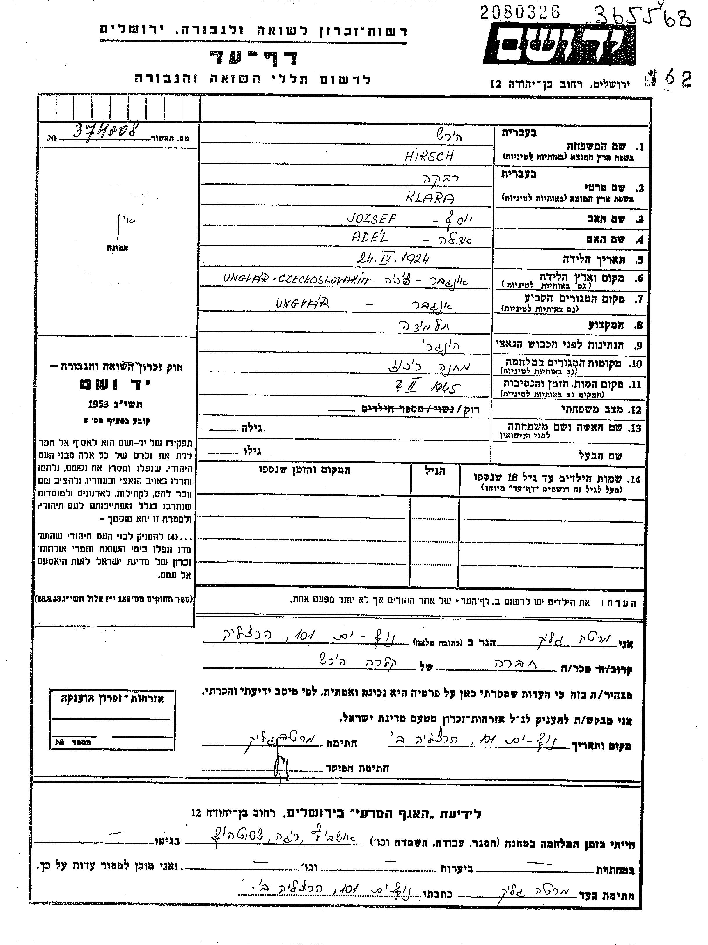 Klara Rivka Hirsch, geb. Hirsch wurde im Jahr 1924 in Ungvar, Tschechoslowakei geboren. Sie war Schüler/-in. Vor dem Zweiten Weltkrieg lebte sie in Ungvar, Tschechoslowakei.