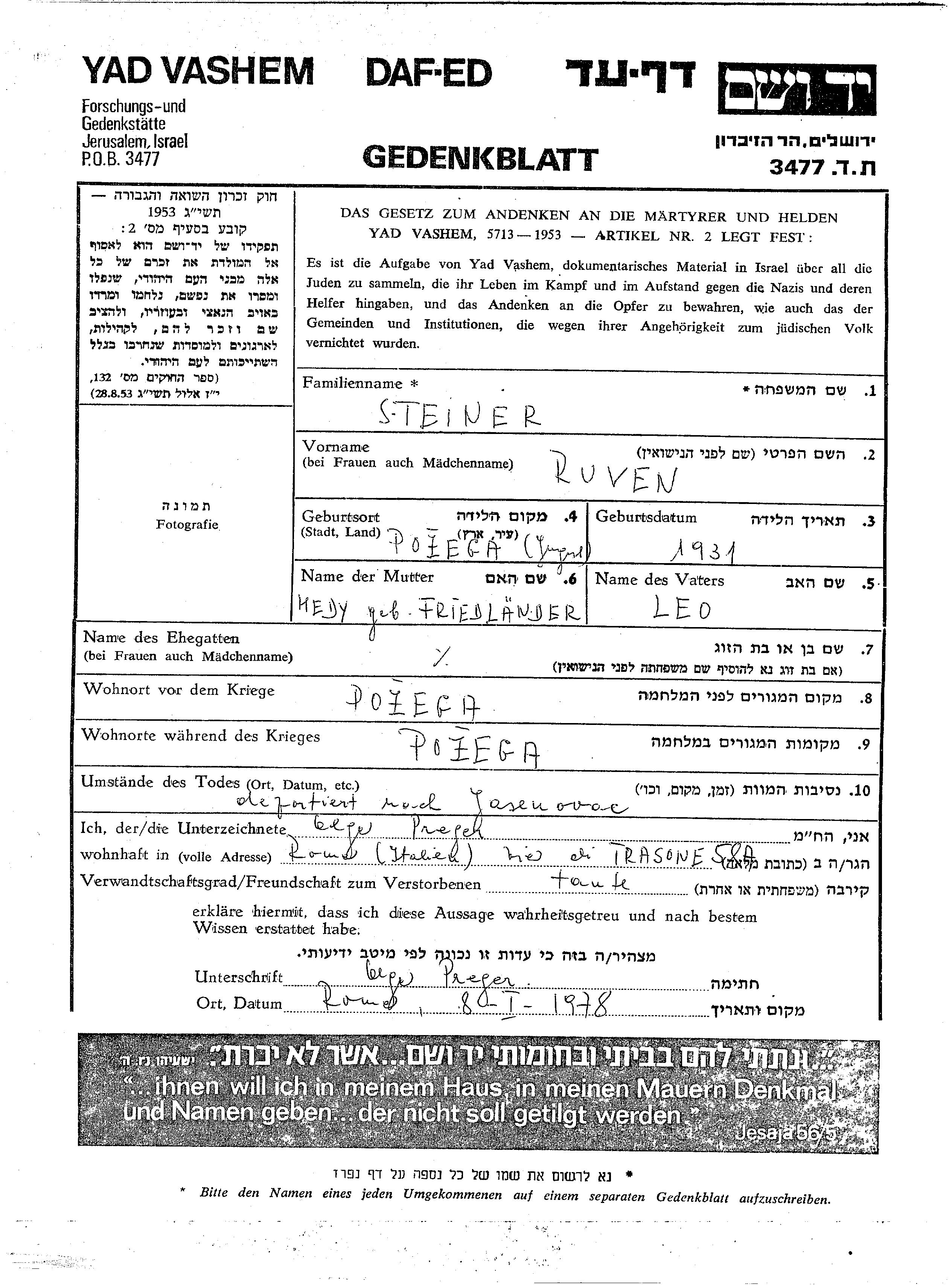 Reuven Stajner wurde im Jahr 1931 in Pozega, Jugoslawien geboren. Er war Student. Vor dem Zweiten Weltkrieg lebte er in Pozega, Jugoslawien.