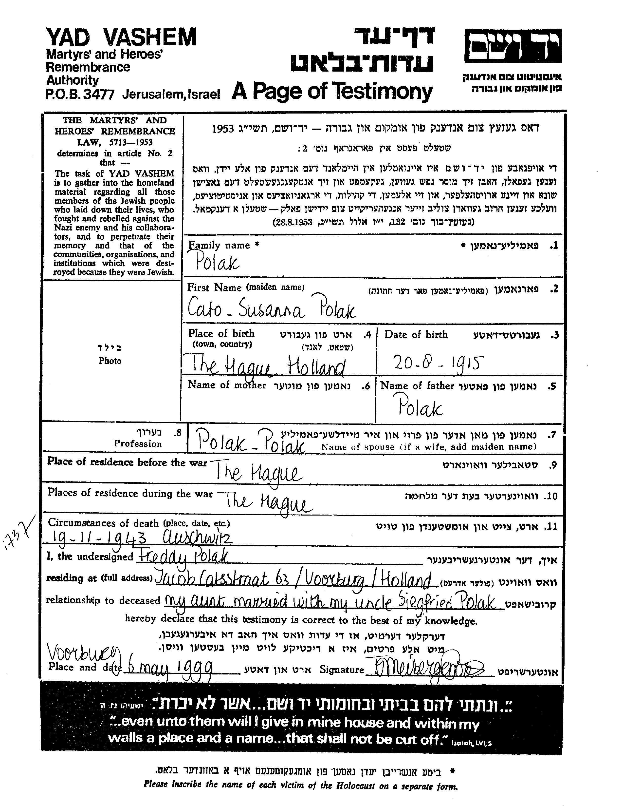 Polak Cato Susanna 1915 Hague, Niederlande Gedenkblatt