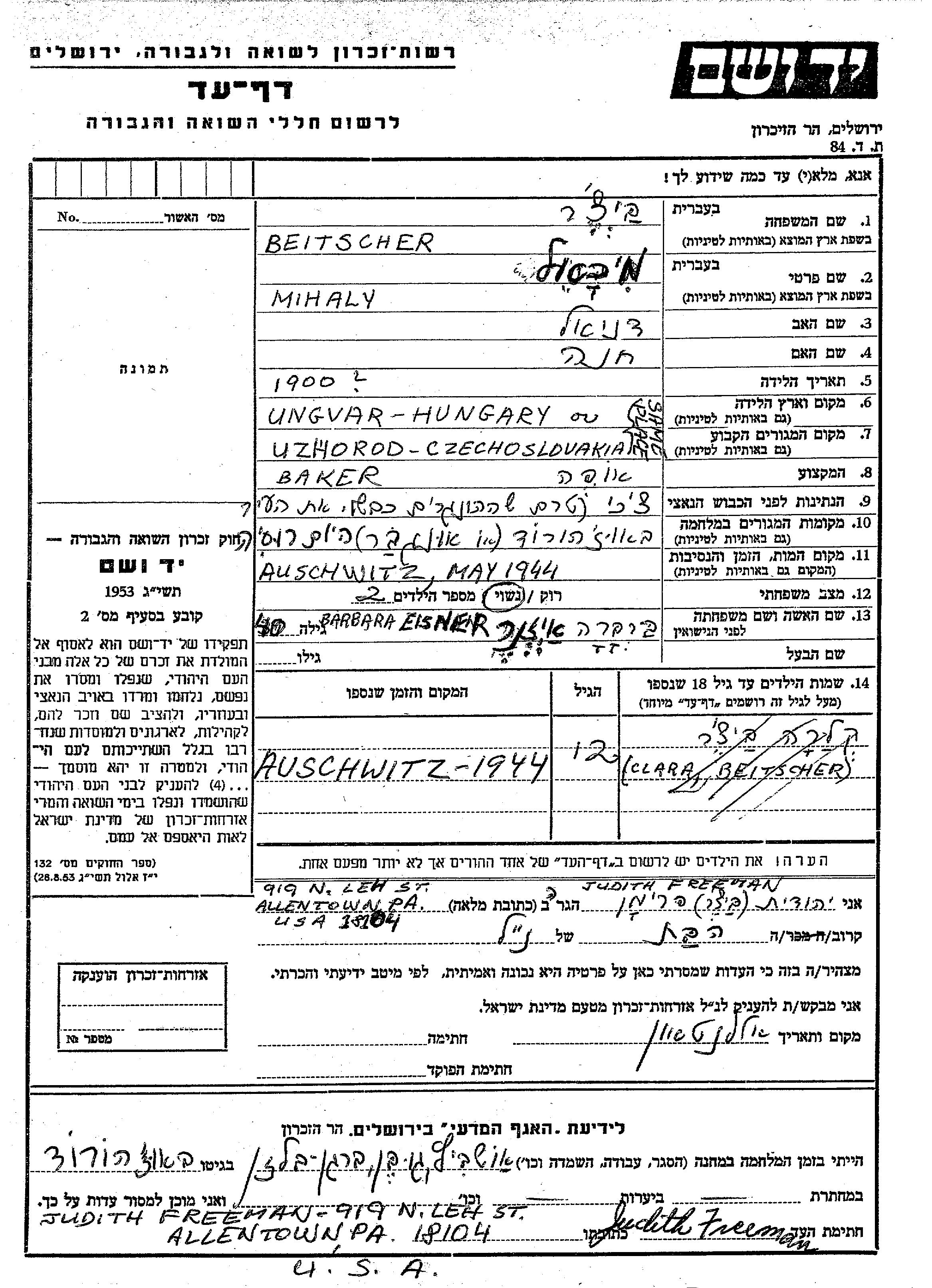 Clara Beitscher. Vor dem Zweiten Weltkrieg lebte sie in Uzhorod, Tschechoslowakei.