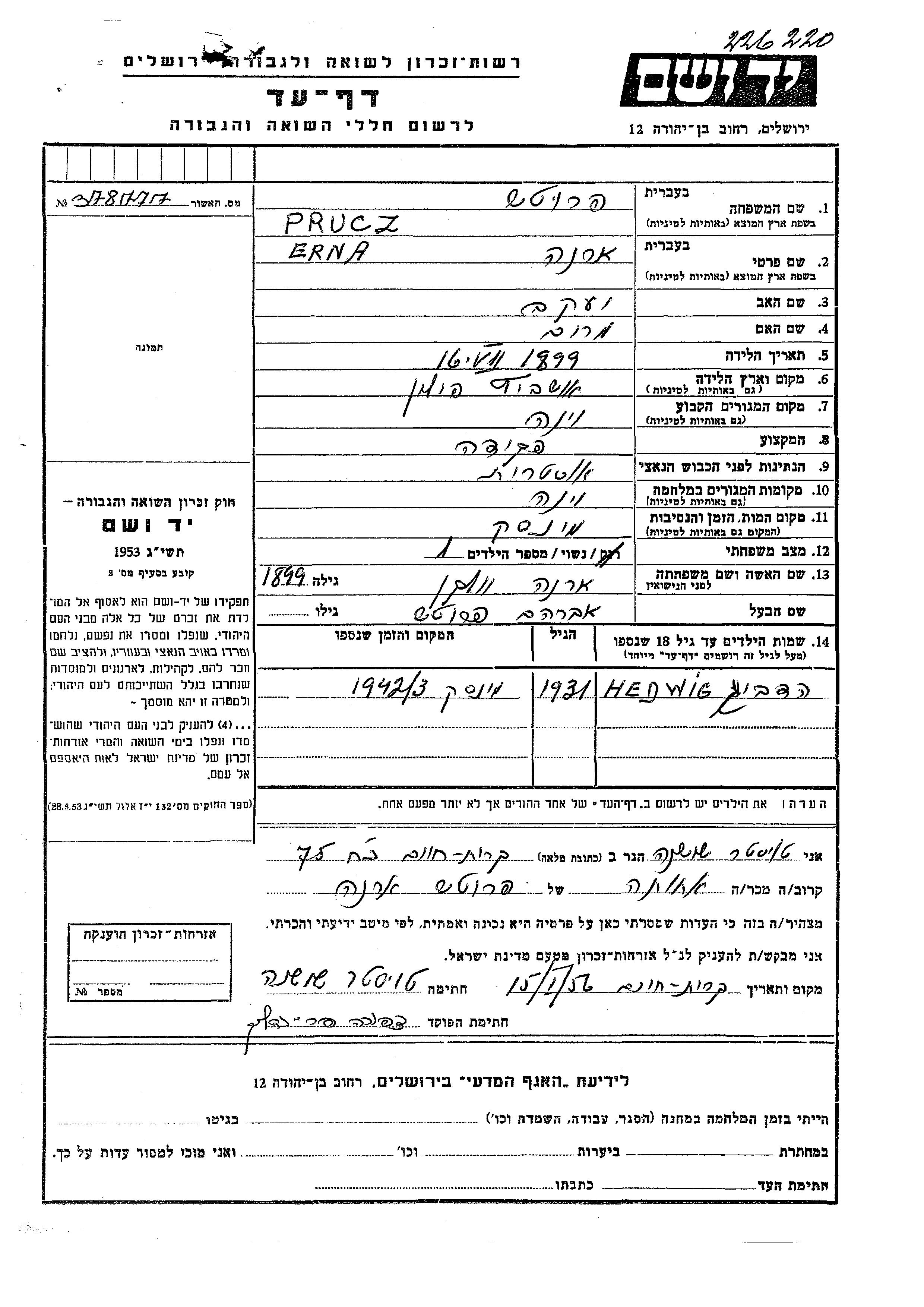 Erna Ernestine Prucz, geb. Vulkan wurde im Jahr 1899 in Oświęcim, Polen geboren. Sie war Angestellte/-r. Vor dem Zweiten Weltkrieg lebte sie in Wien, Österreich.