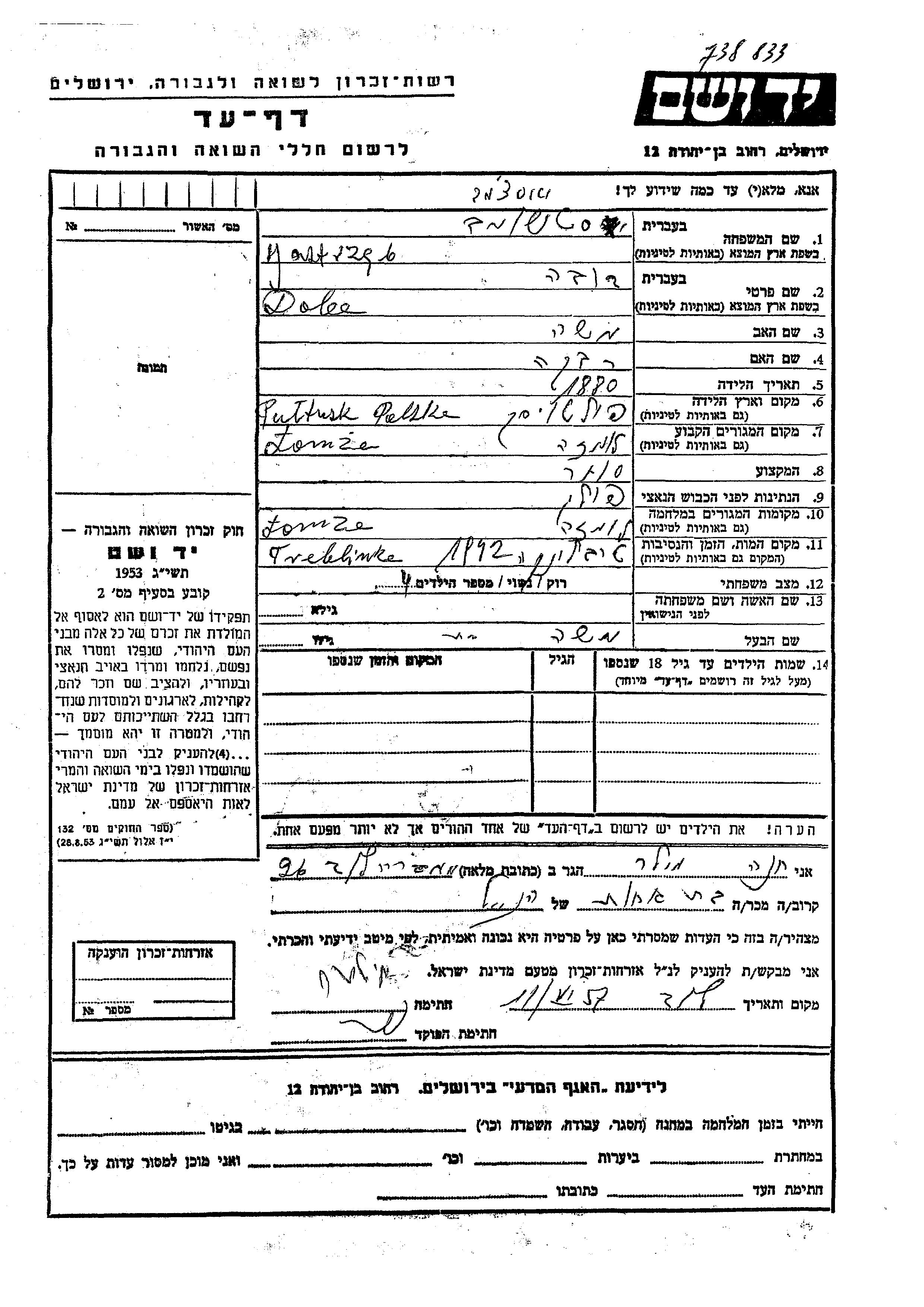 Doba wurde in der Schoah ermordet. Todesort: Treblinka, Polen im Jahr 1942.