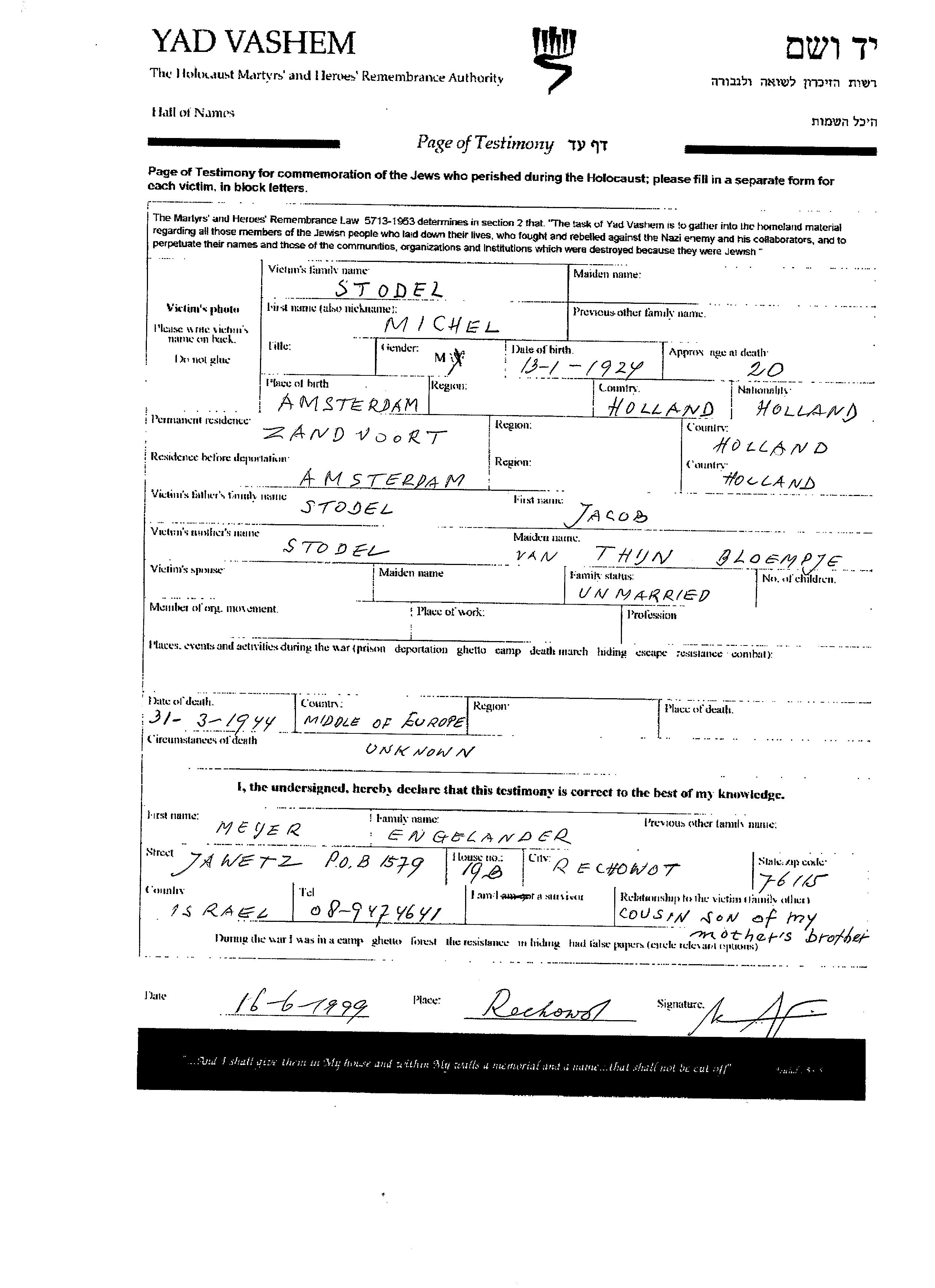 Michel Stodel wurde im Jahr 1924 in Amsterdam, Niederlande geboren. Vor dem Zweiten Weltkrieg lebte er in Zandvoort, Niederlande.