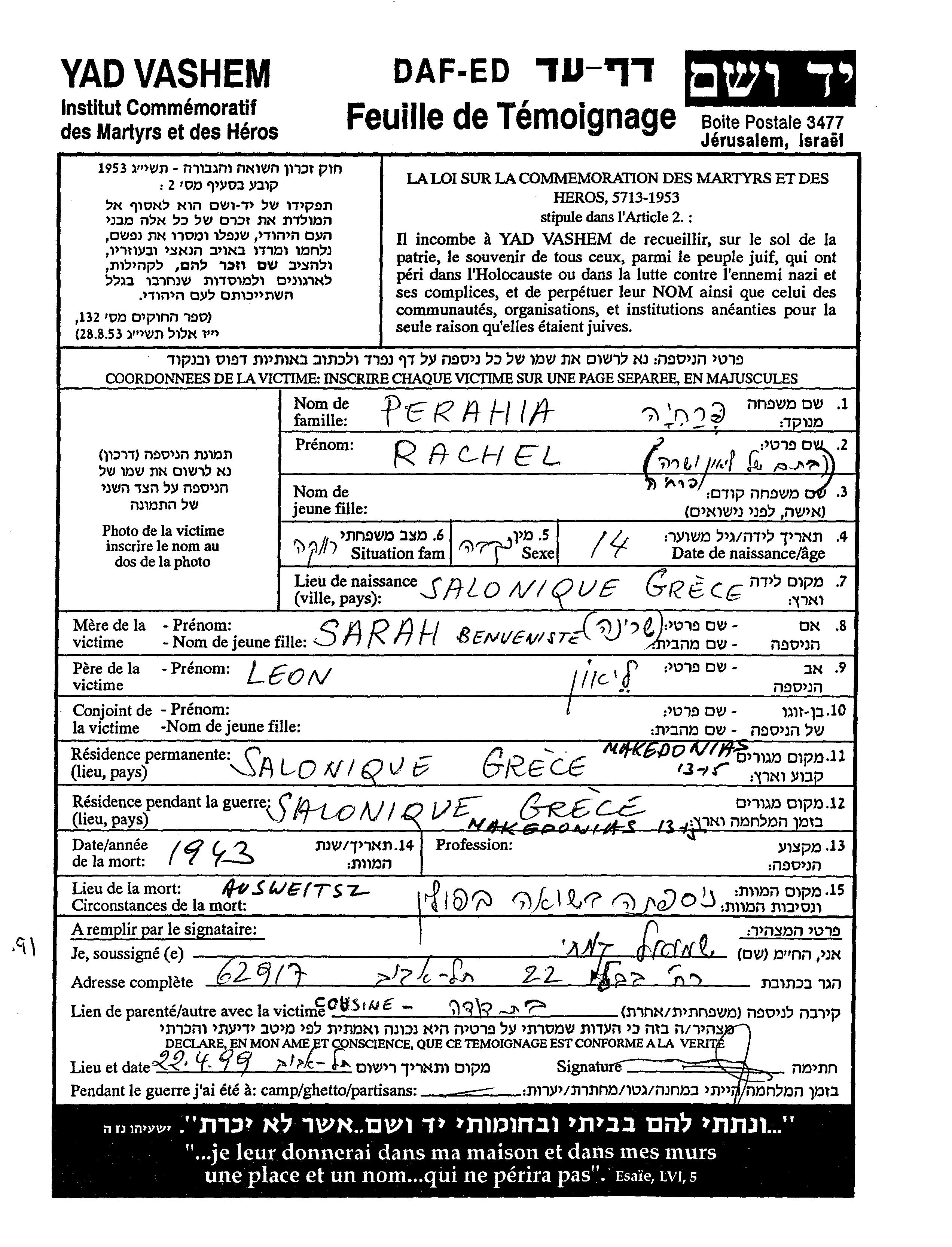 | Perahia | Rahil | Thessaloniki, Griechenland | Liste von ermordeten Personen |