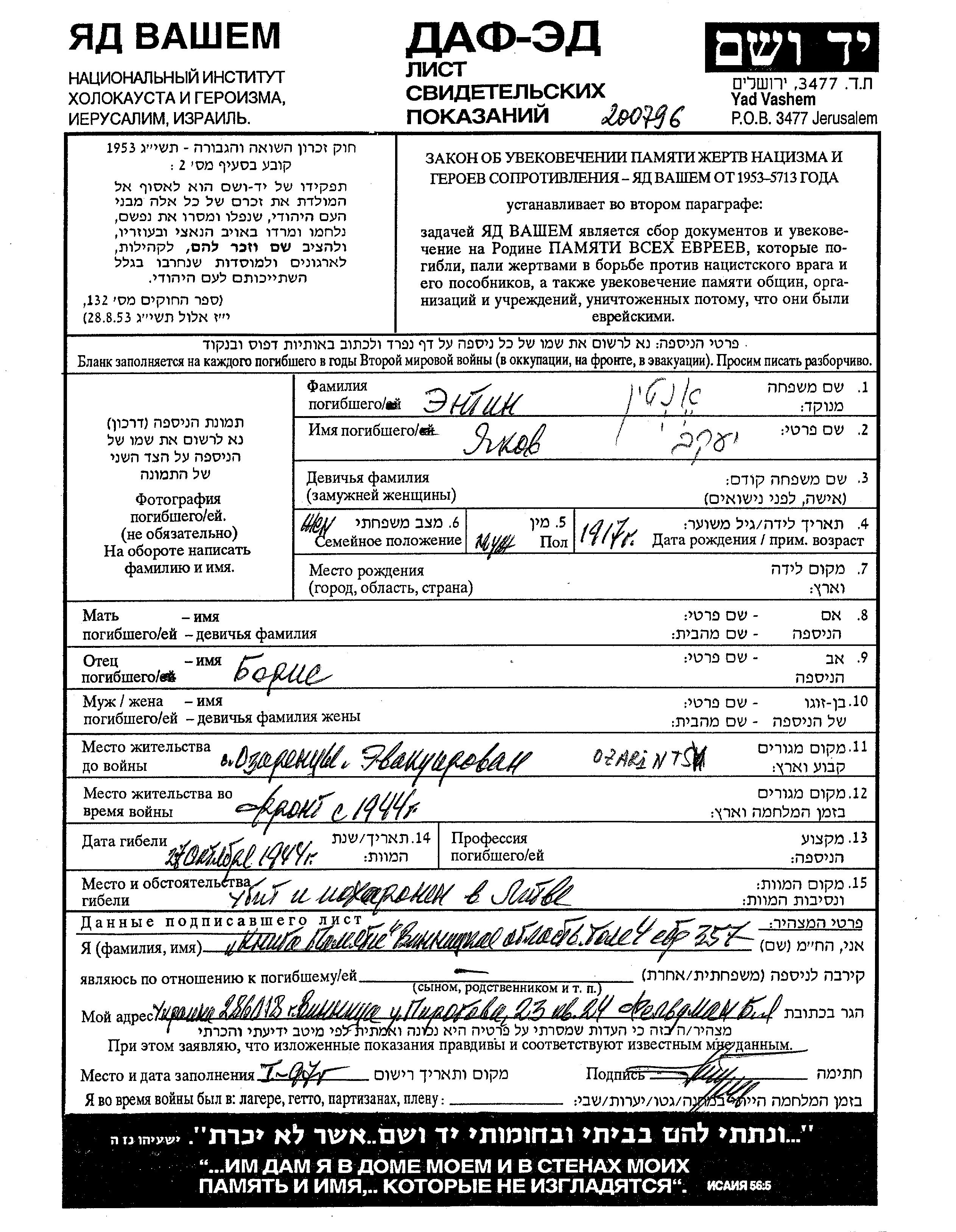 | Entin | Yakov | 1917 | Ozarintsy, Ukraine (UdSSR) | Gedenkblatt |