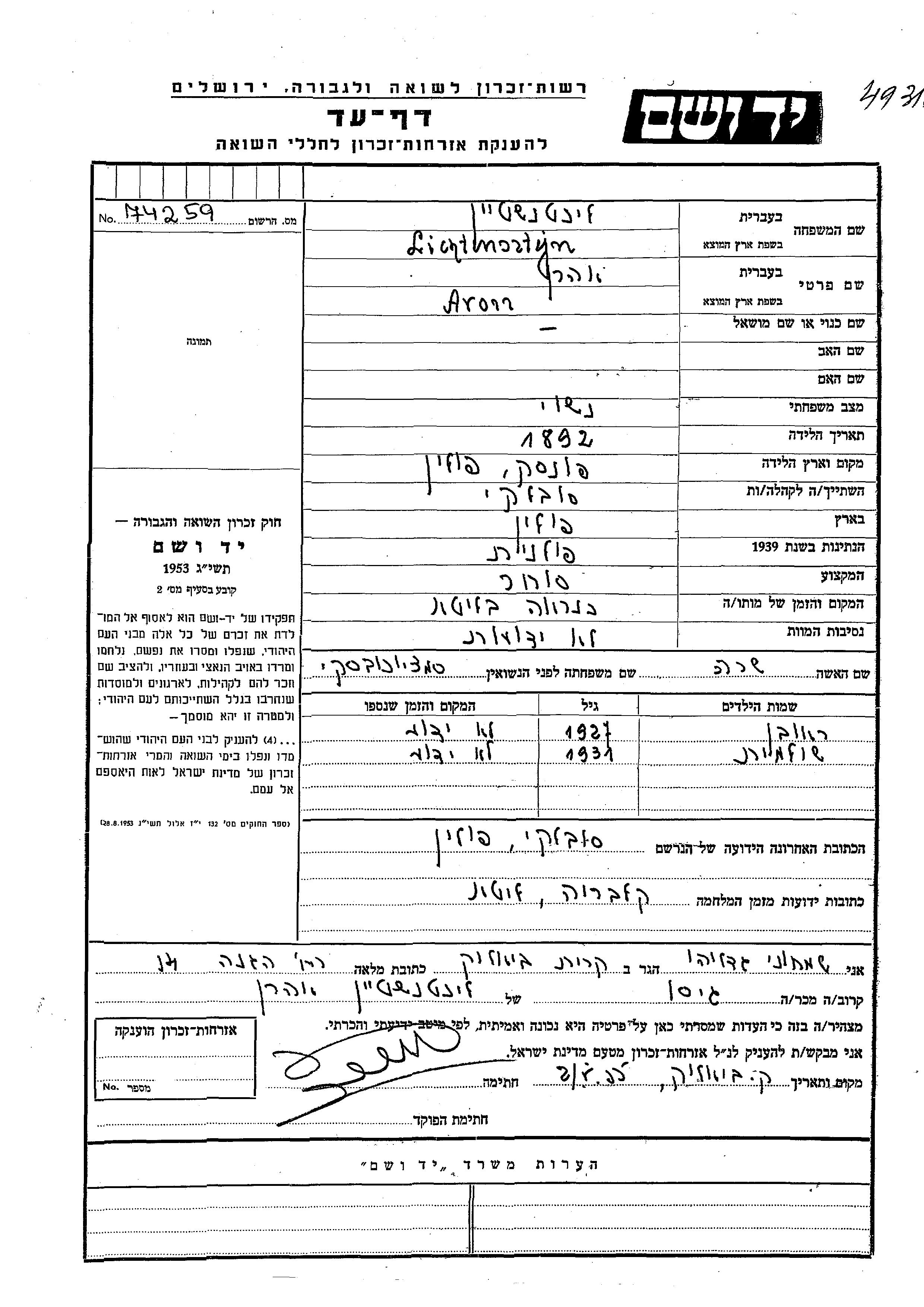 Aron wurde in der Schoah ermordet. Todesort: Litauen.
