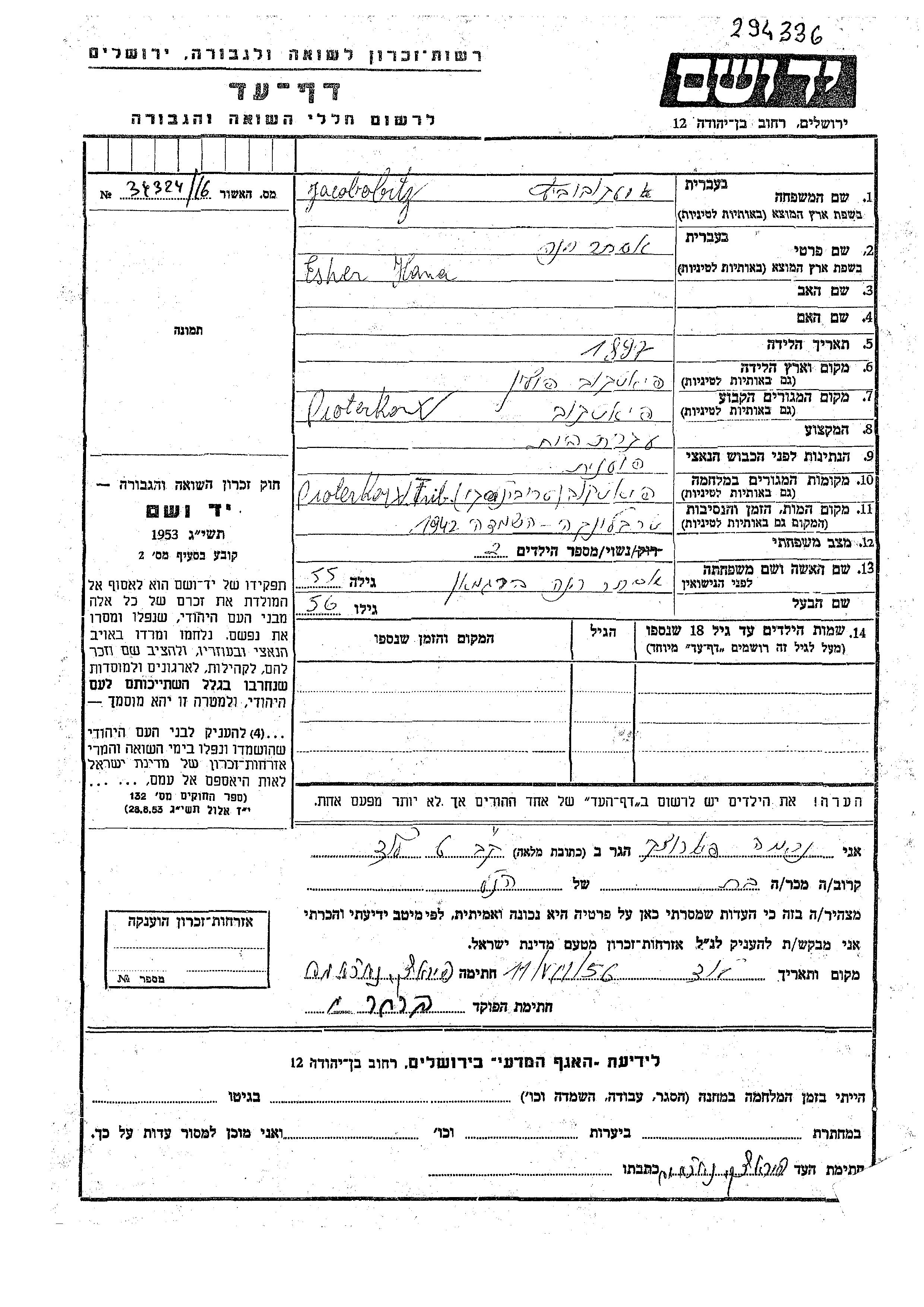 Hana Ester Jacobobitz, geb. Bergman wurde im Jahr 1897 in Piotrkow, Polen geboren. Sie war Hausfrau und Verheiratet. Vor dem Zweiten Weltkrieg lebte sie in Piotrkow, Polen. Während des Krieges war sie in Piotrkow, Polen.