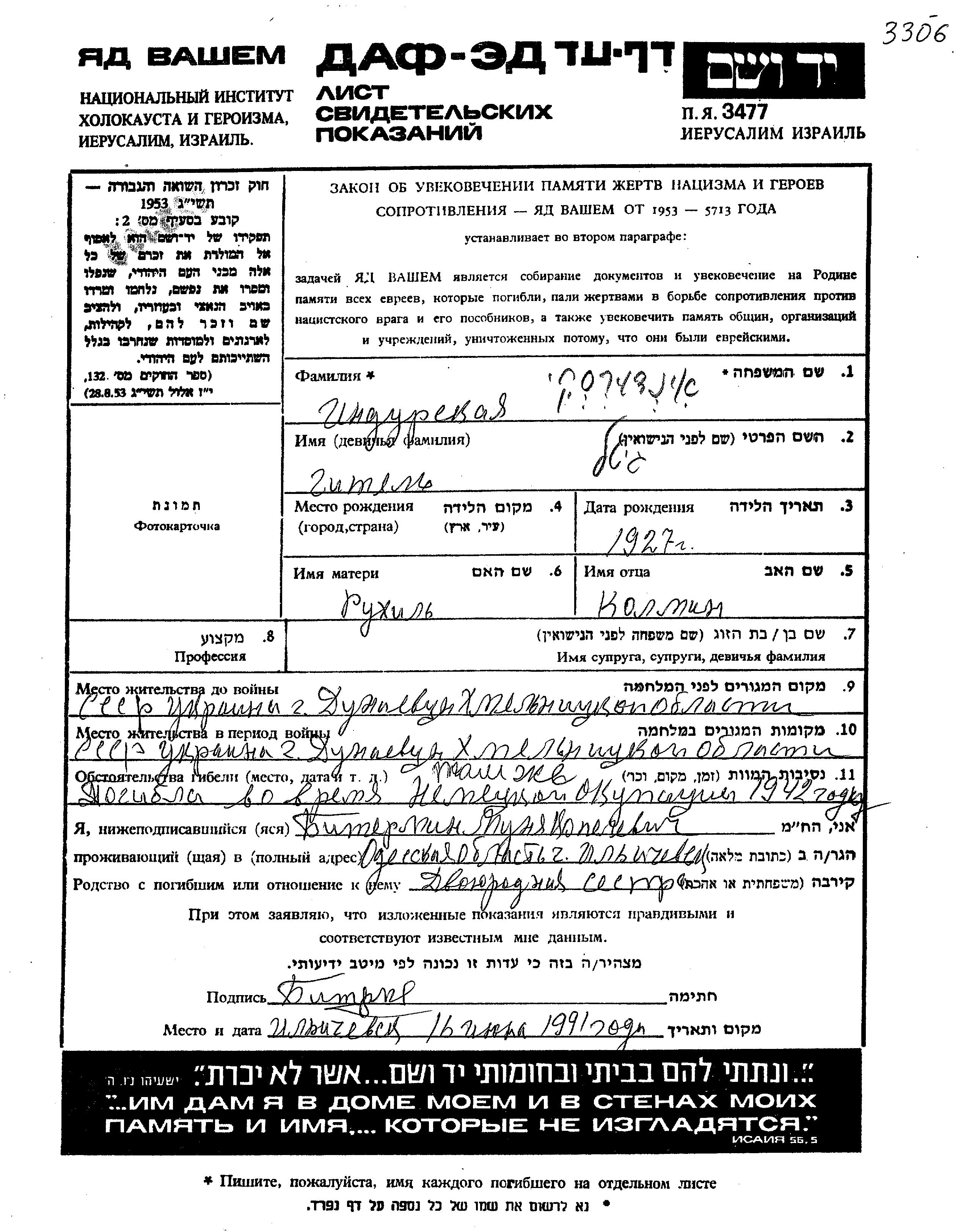 Indurski Gitel 1927 Dunayevtsy, Ukraine (UdSSR) Gedenkblatt