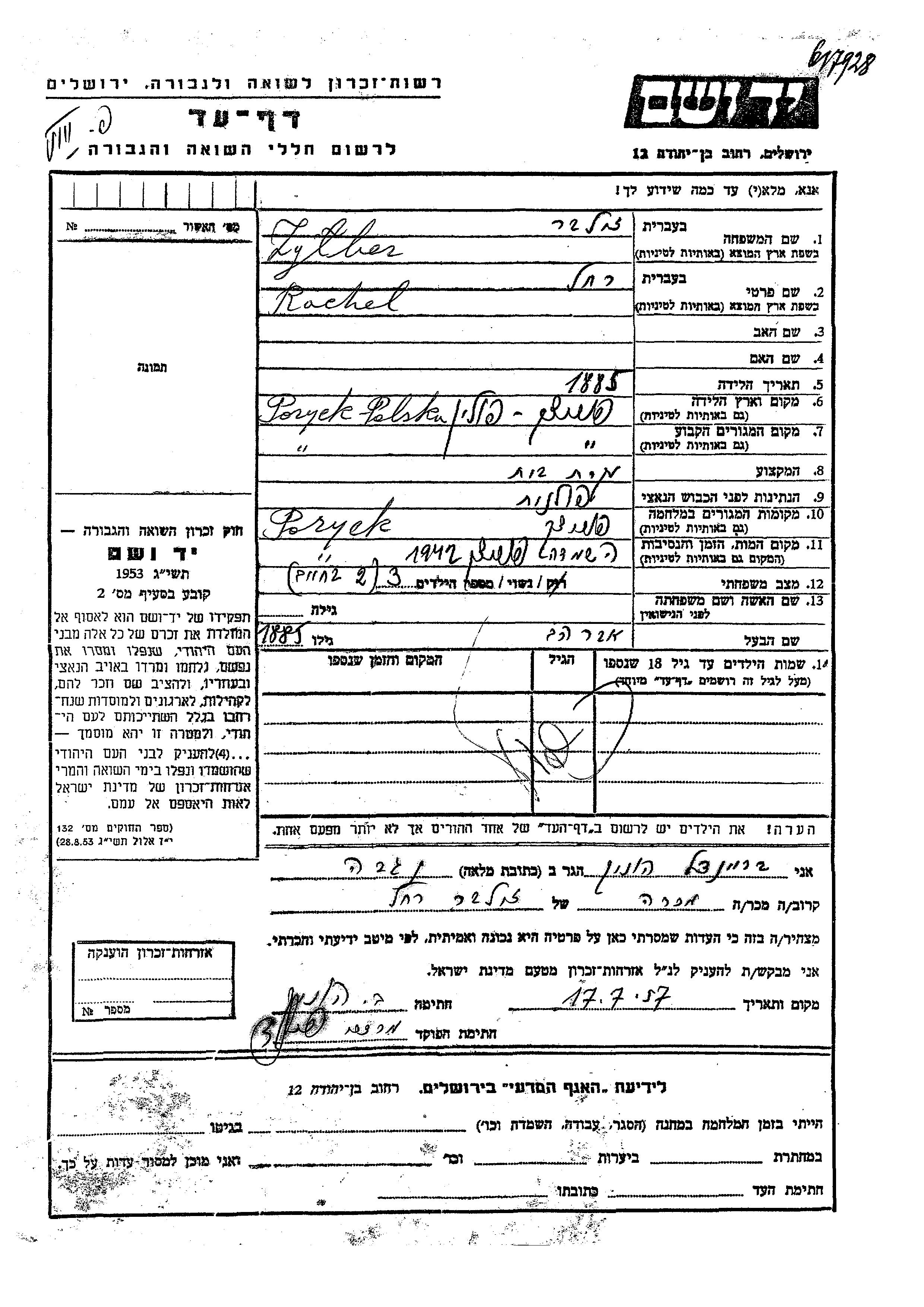 Rachel Zylber wurde im Jahr 1885 in Poryck, Polen geboren. Sie war Hausfrau. Vor dem Zweiten Weltkrieg lebte sie in Poryck, Polen.