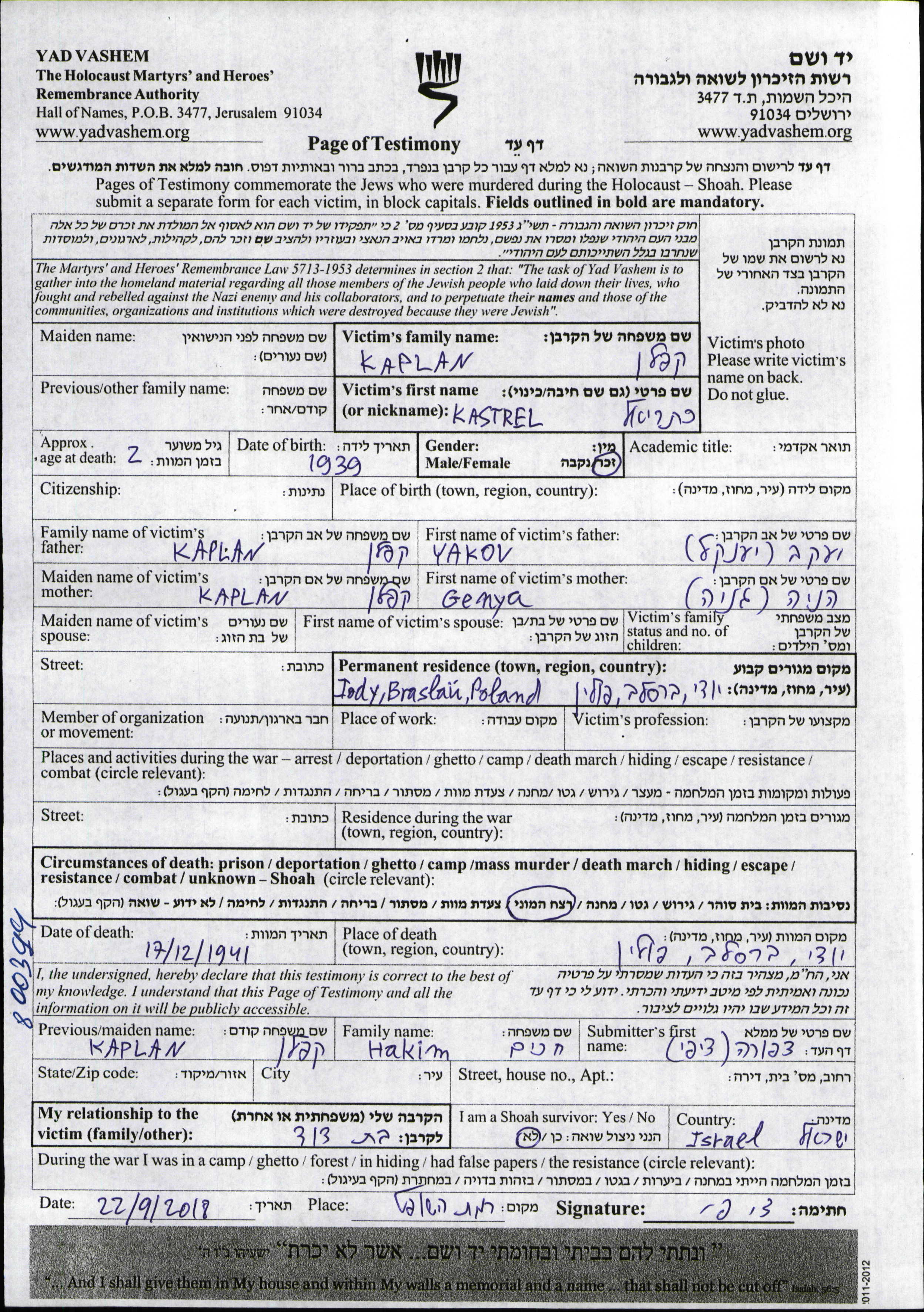 Kastrel Kaplan wurde im Jahr 1939 geboren. Vor dem Zweiten Weltkrieg lebte er in Jody, Polen.