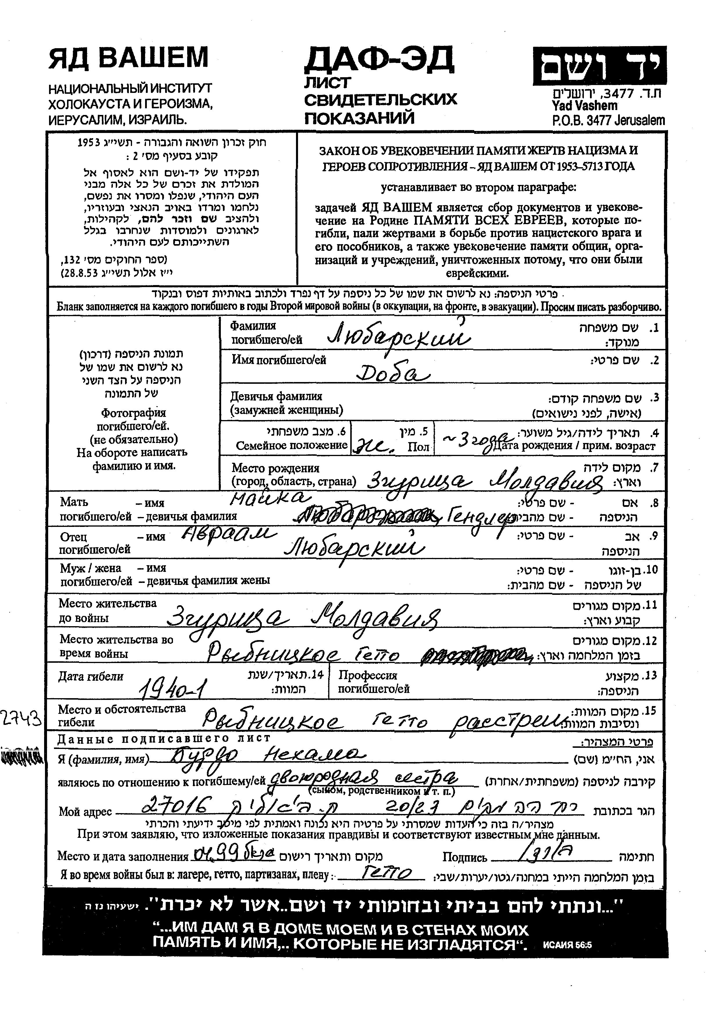 Devora Doba wurde in der Schoah ermordet. Todesort: Rybnitsa, Ukraine (UdSSR) im Jahr 1940.