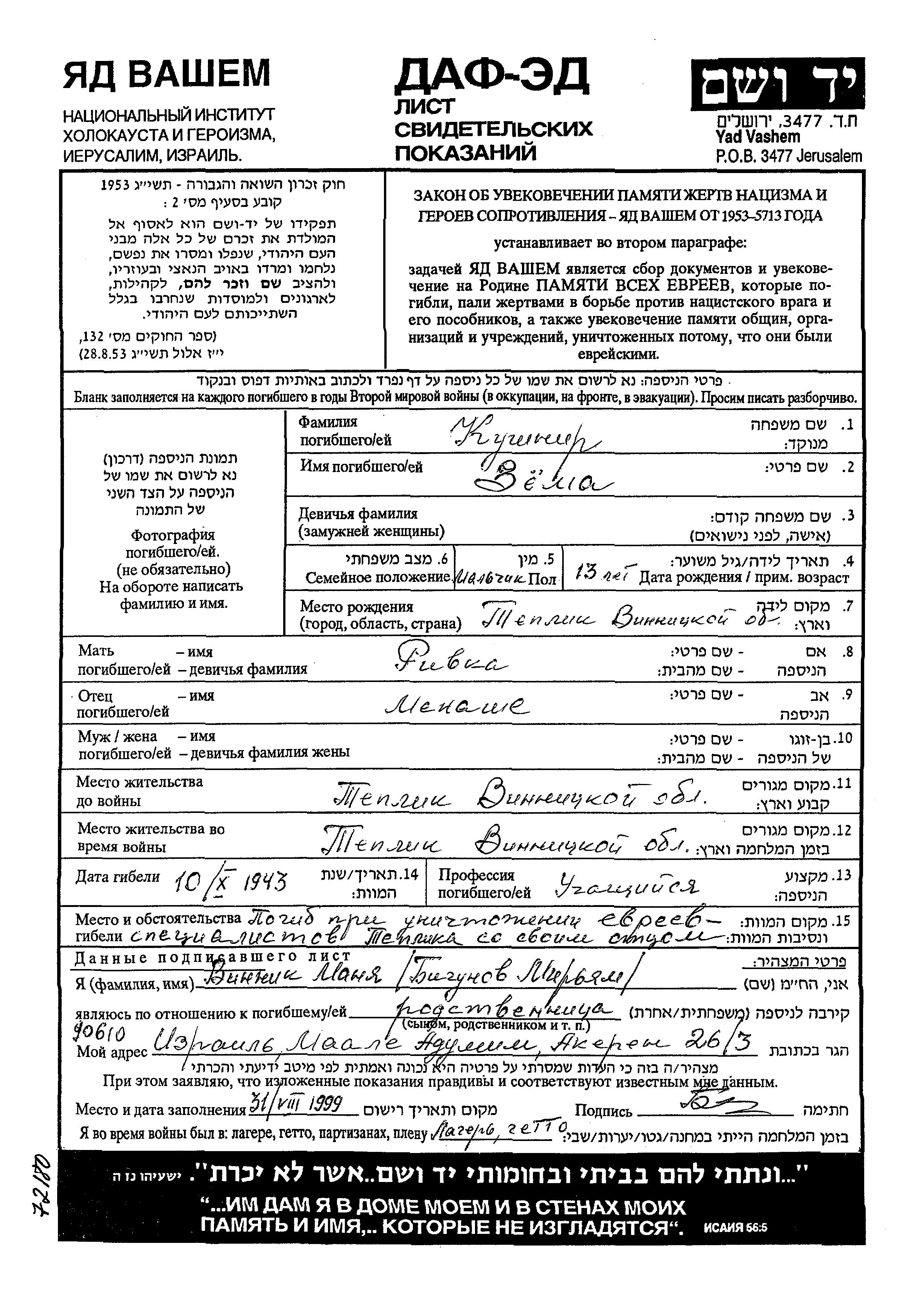 Zyoma wurde in der Schoah ermordet. Todesort: Teplik, Ukraine (UdSSR) im Jahr 1943.