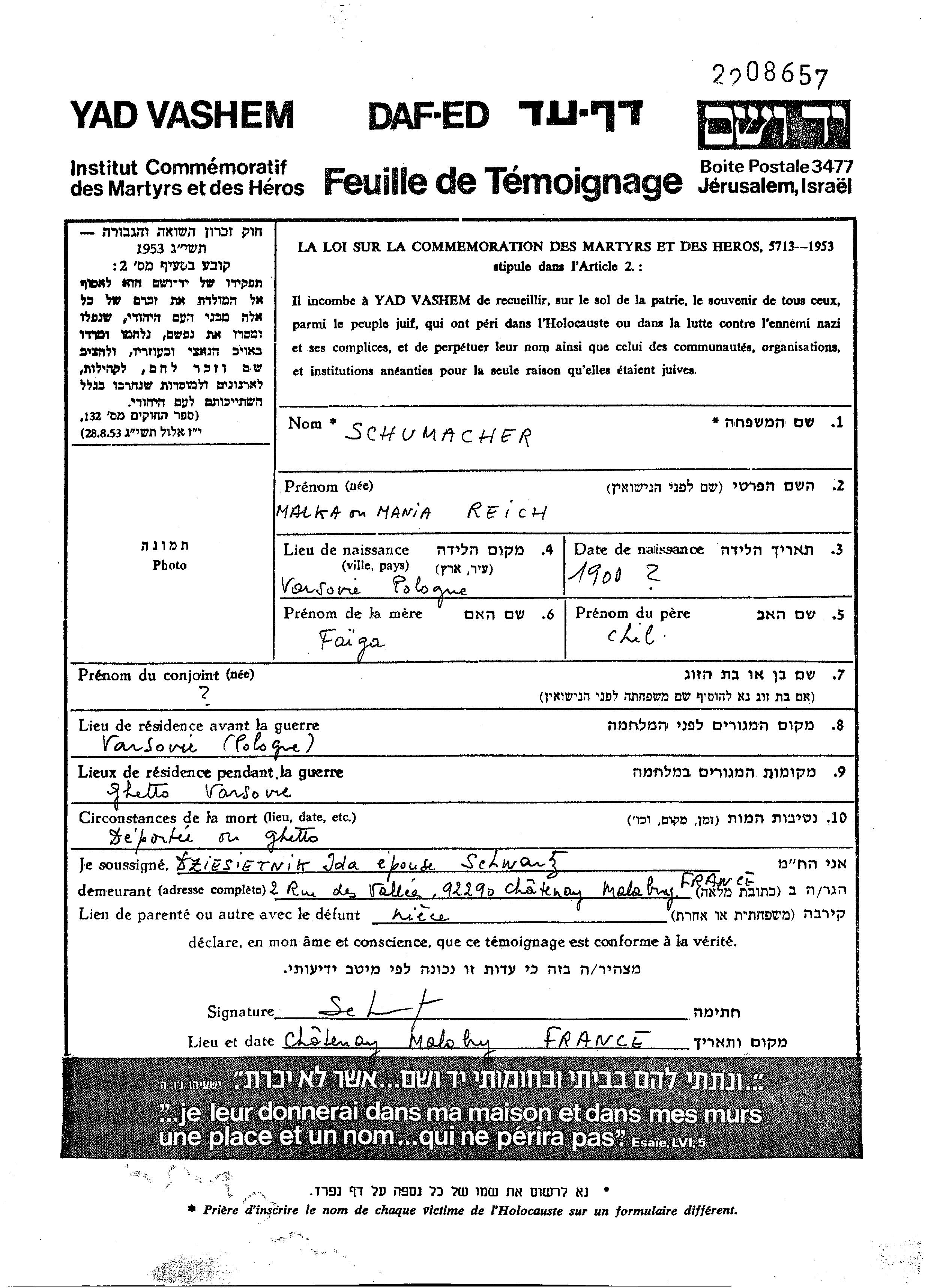 Genia Mania Malka Schumacher, geb. Reich wurde in Warszawa, Polen geboren. Vor dem Zweiten Weltkrieg lebte sie in Warszawa, Polen.