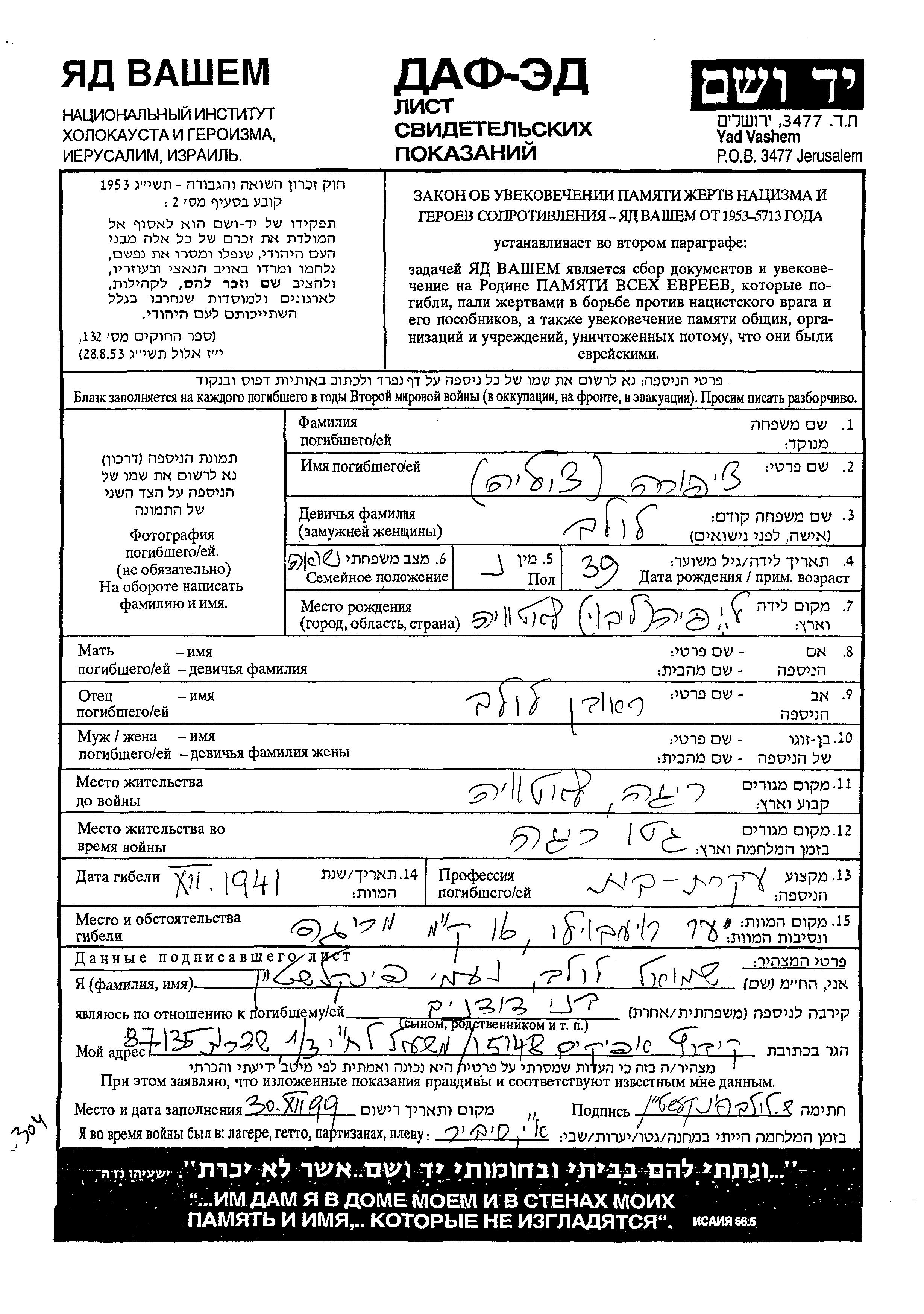 Tzilya Tzipora Name unbekannt Pines, geb. Lulov wurde im Jahr 1910 in Liepaja, Lettland geboren. Sie war Hausfrau. Vor dem Zweiten Weltkrieg lebte sie in Riga, Lettland. Tzilya Tzipora wurde in der Schoah ermordet. Todesort: unbekannter Ort im Jahr 1941.