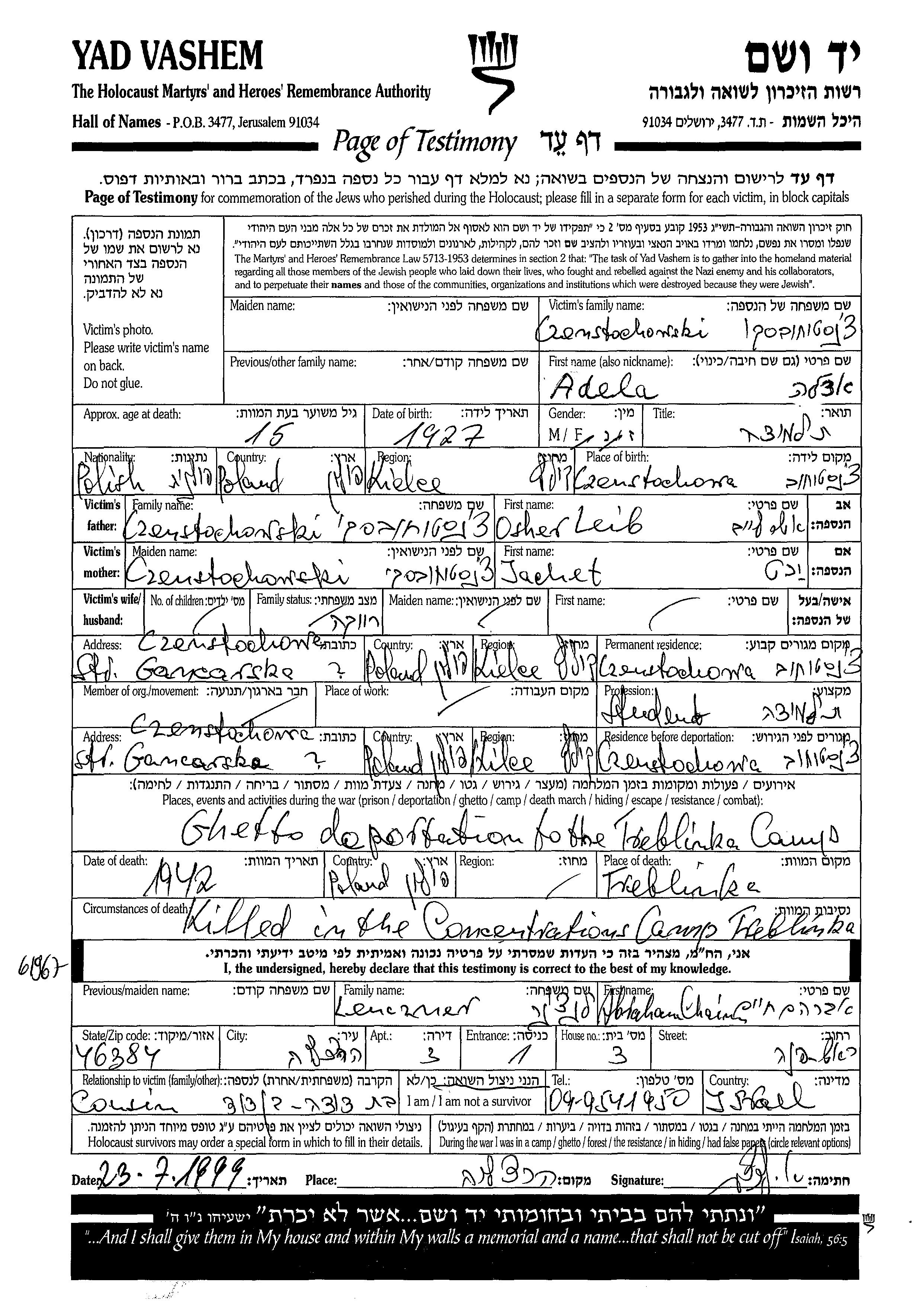 Adela wurde in der Schoah ermordet. Todesort: Treblinka, Polen im Jahr 1942.