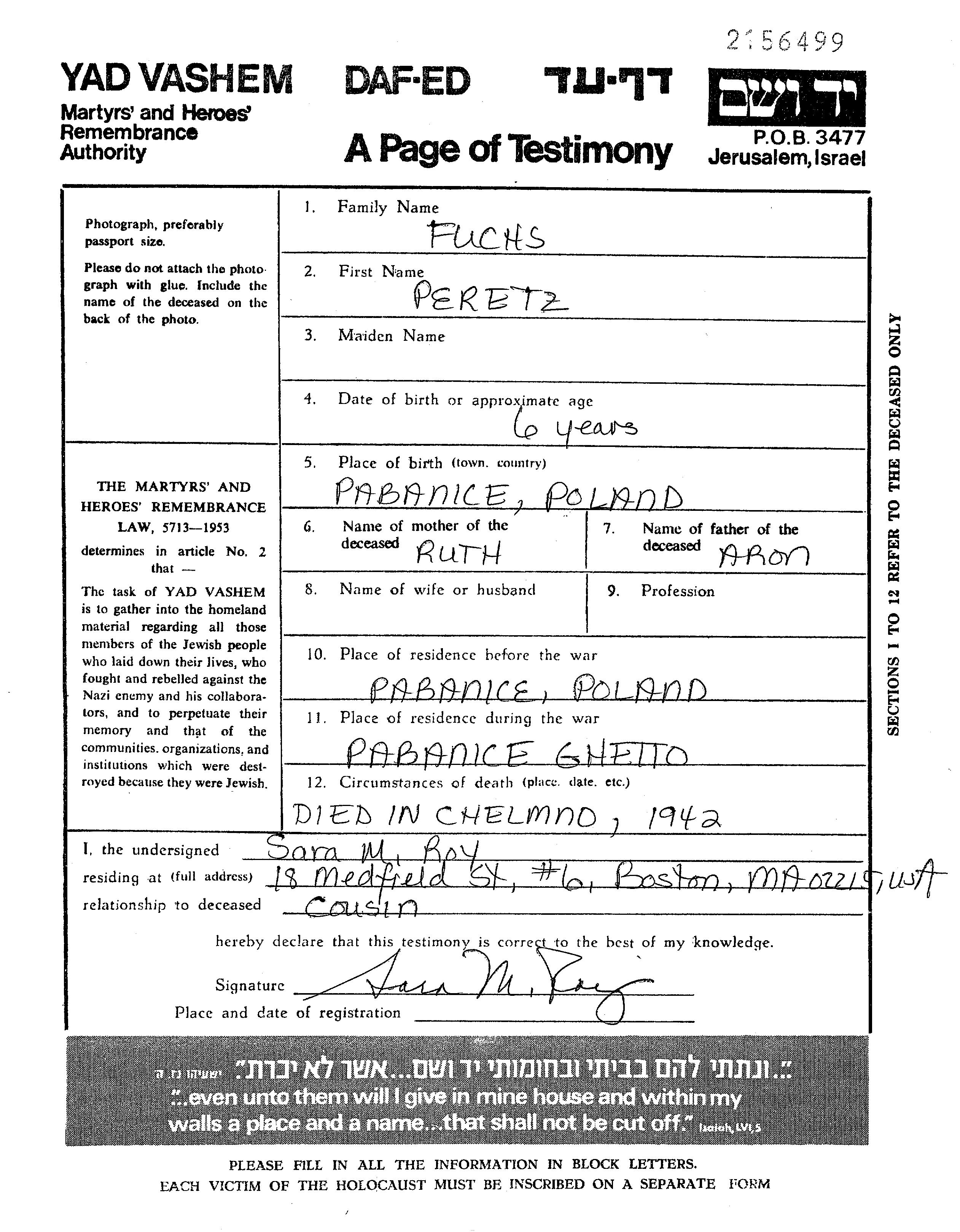Peretz wurde in der Schoah ermordet. Todesort: Chelmno, Polen im Jahr 1942.