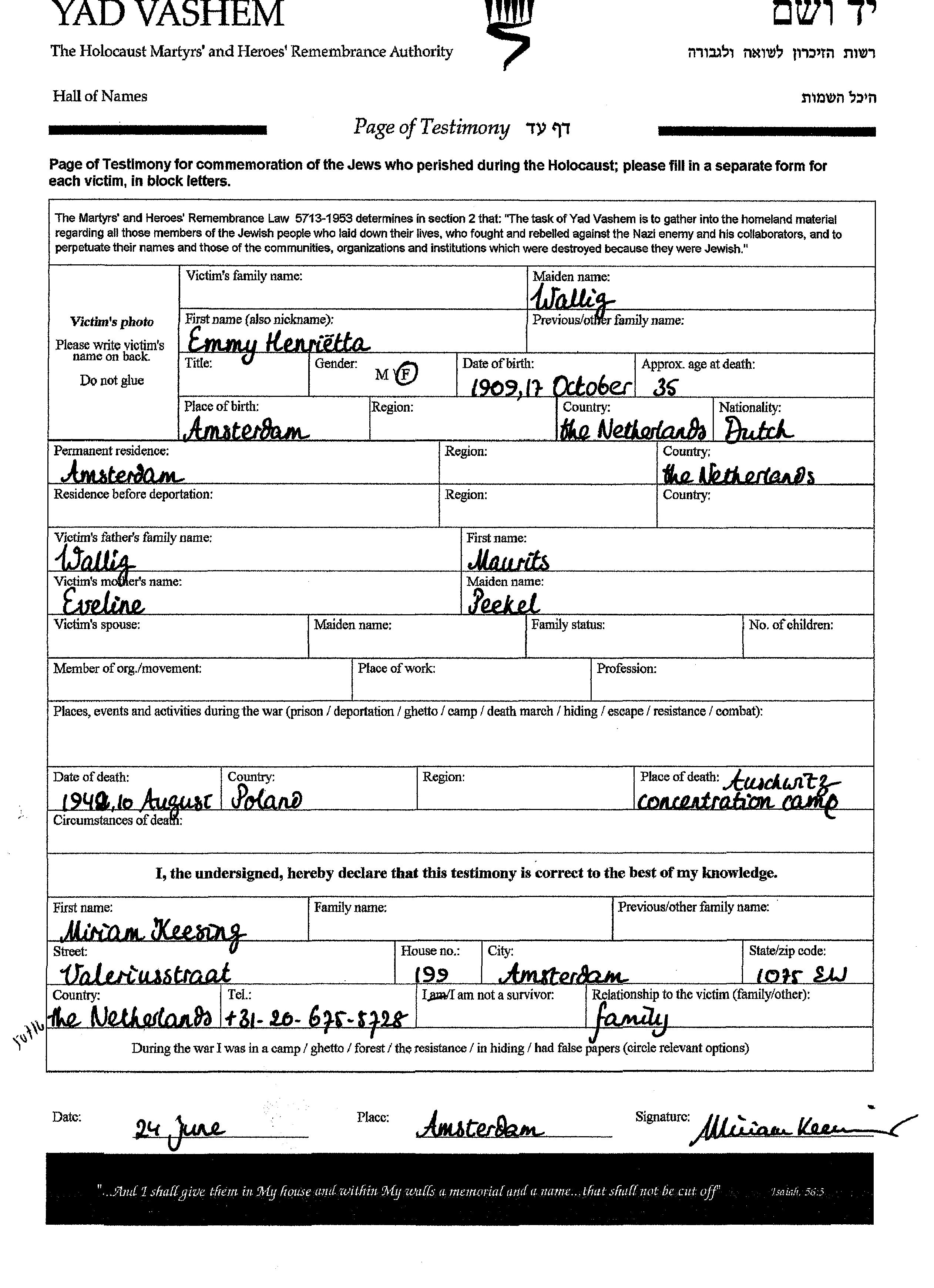 | Wallig | Emmy Henriette | 1909 | Amsterdam, Niederlande | Liste von ermordeten Juden aus Holland |