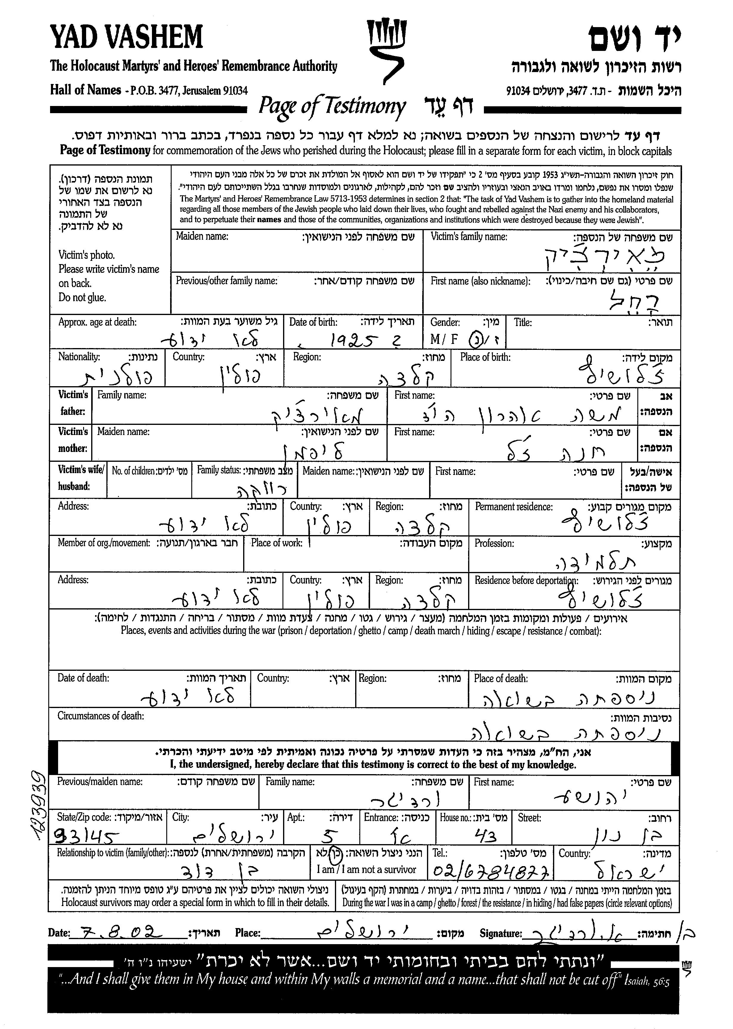 Rivka Rakhel wurde in der Schoah ermordet. Todesort: unbekannter Ort.