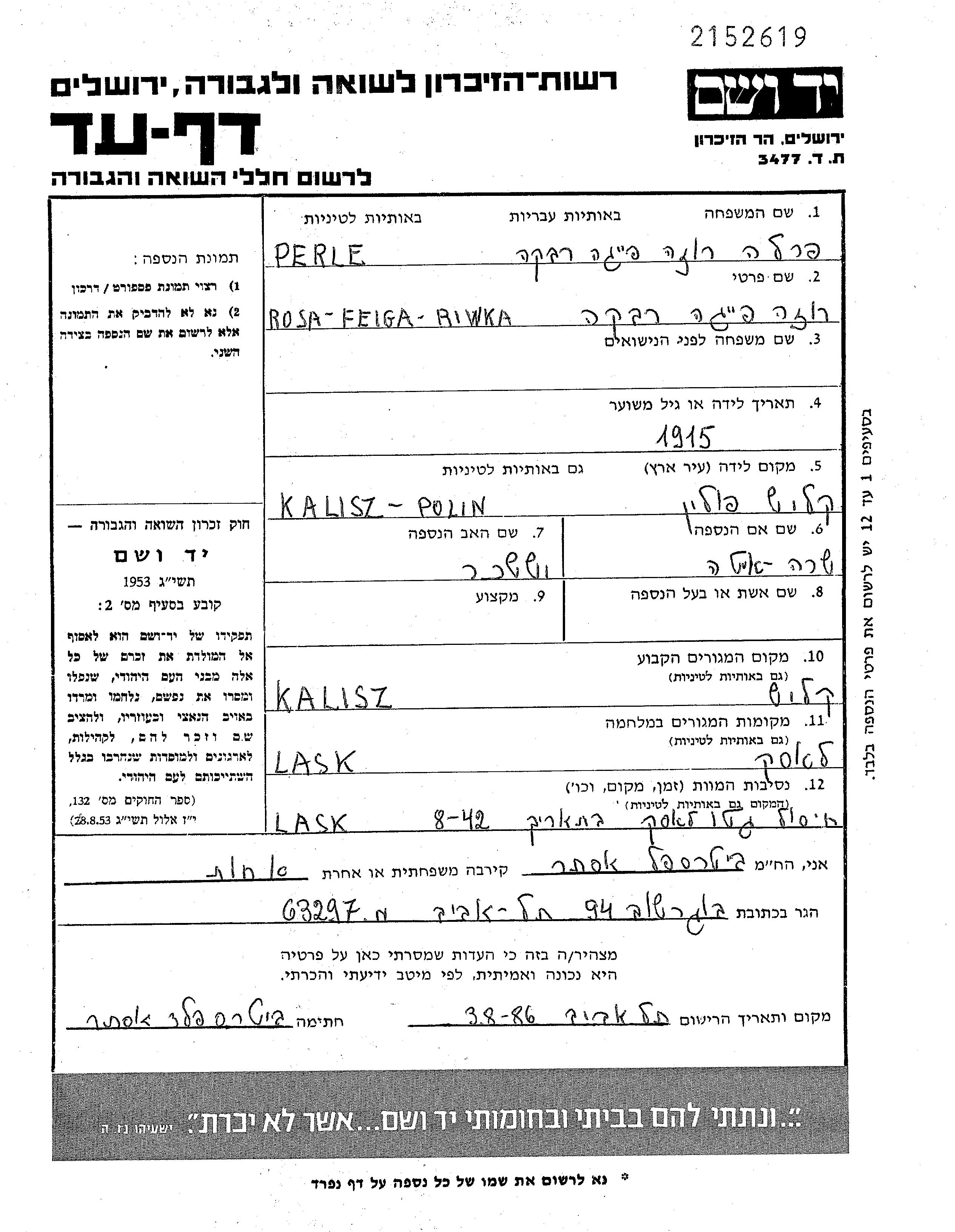 Rojza Rywka Feiga Perle wurde im Jahr 1915 in Kalisz, Polen geboren. Vor dem Zweiten Weltkrieg lebte sie in Kalisz, Polen.