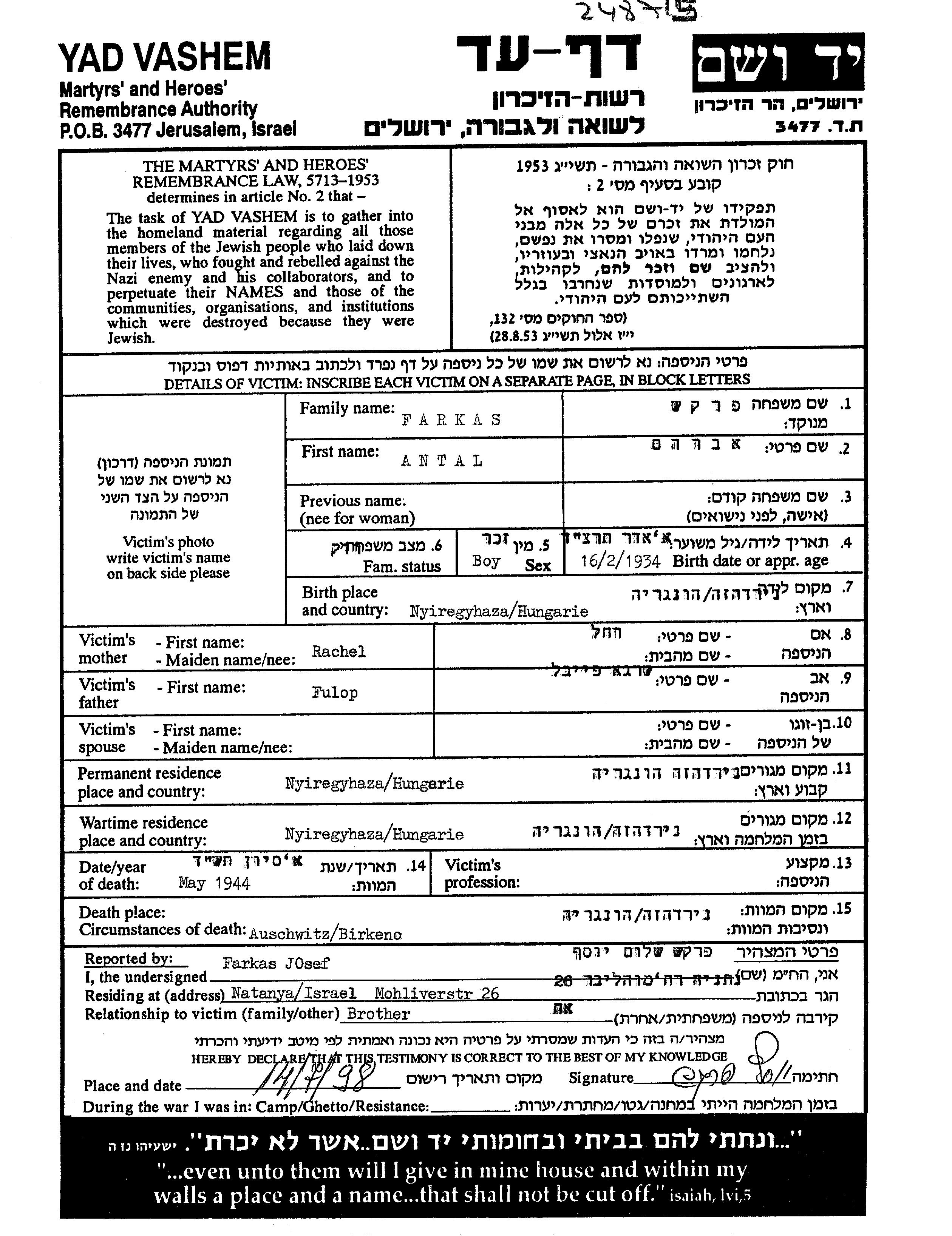 Farkas Antal Avraham 1934 Nyiregyhaza, Ungarn Gedenkblatt