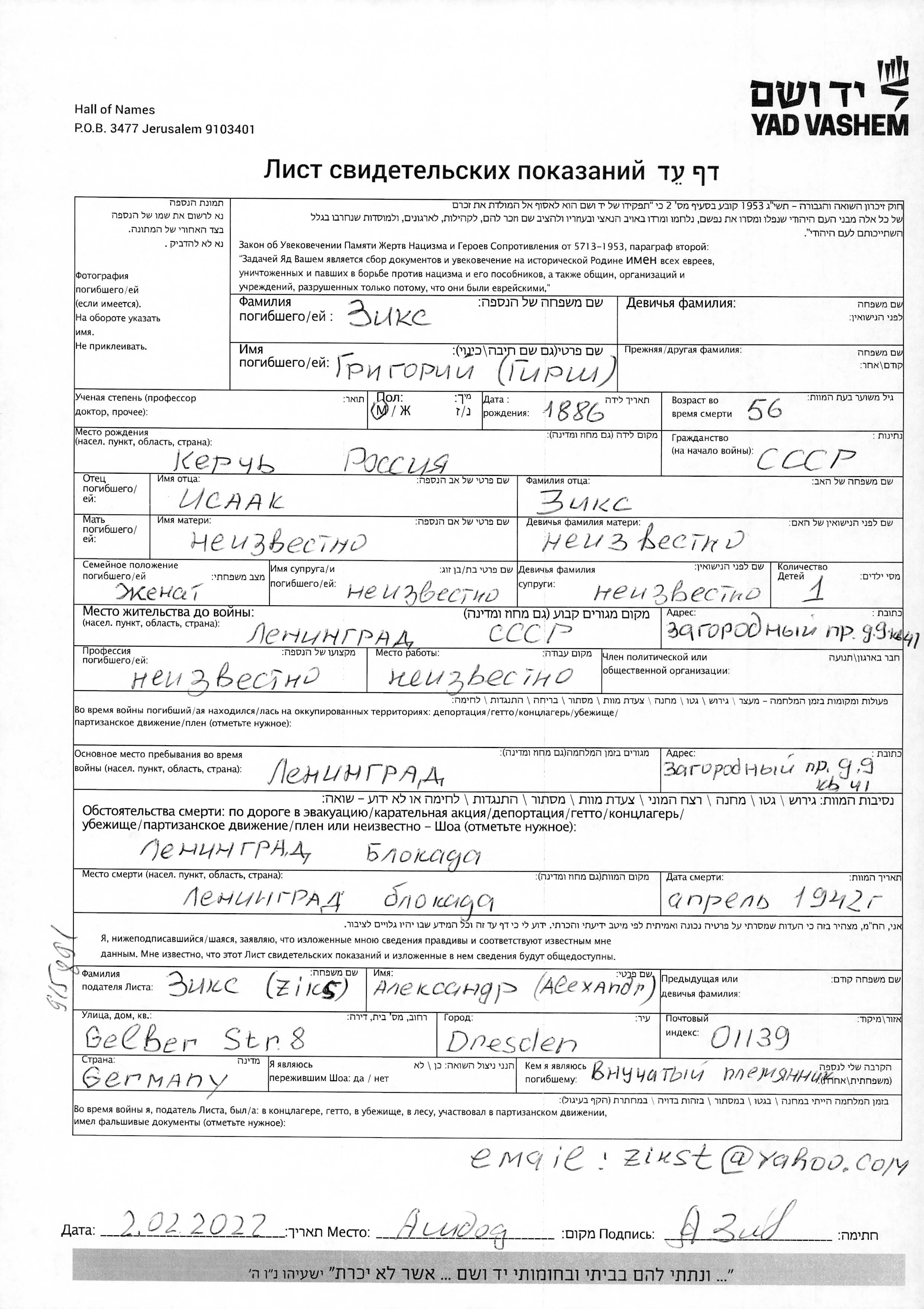 Grigoriy Girsh Ziks wurde im Jahr 1886 in Kerch, Russland (UdSSR) geboren. Er war der Sohn von Isaak. Er war Verheiratet. Vor dem Zweiten Weltkrieg lebte er in Leningrad, Russland (UdSSR). Während des Krieges war er in Leningrad, Russland (UdSSR).