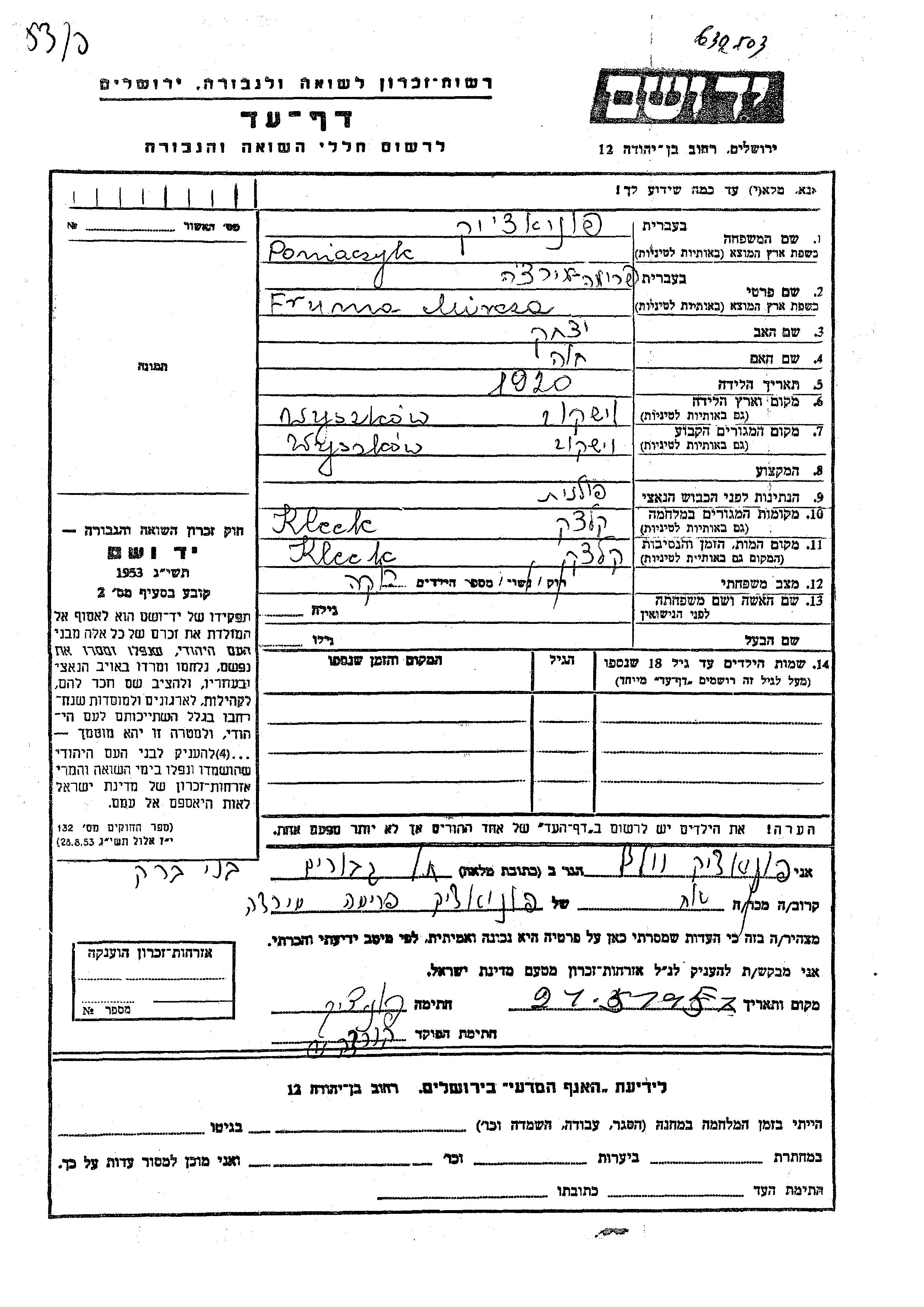 Fruma Mirca Poniaczyk wurde im Jahr 1920 in Wyszkow, Polen geboren. Sie war die Tochter von Yitzkhak und Khava. Sie war Ledig. Vor dem Zweiten Weltkrieg lebte sie in Wyszkow, Polen. Während des Krieges war sie in Kleck, Polen.