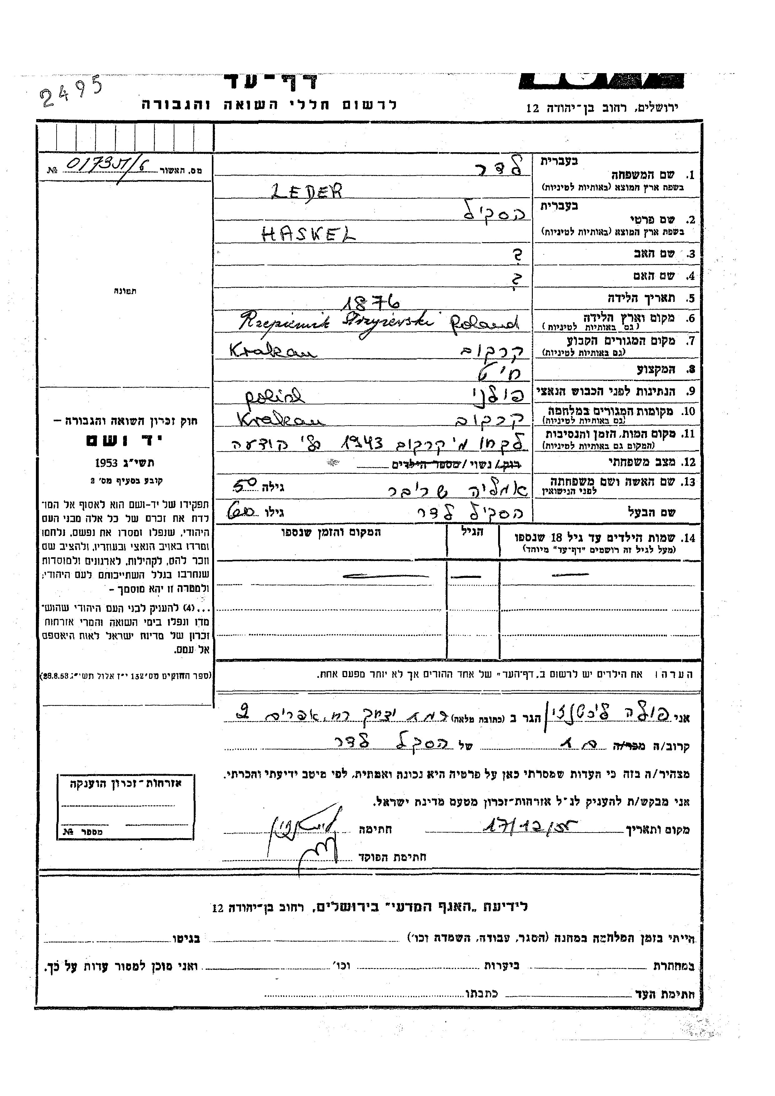 Haskiel Leder wurde im Jahr 1876 geboren. Er war Schneider und mit Amalia, geb. Shreiber Verheiratet. Vor dem Zweiten Weltkrieg lebte er in Krakow, Polen. Während des Krieges war er in Krakow, Polen.