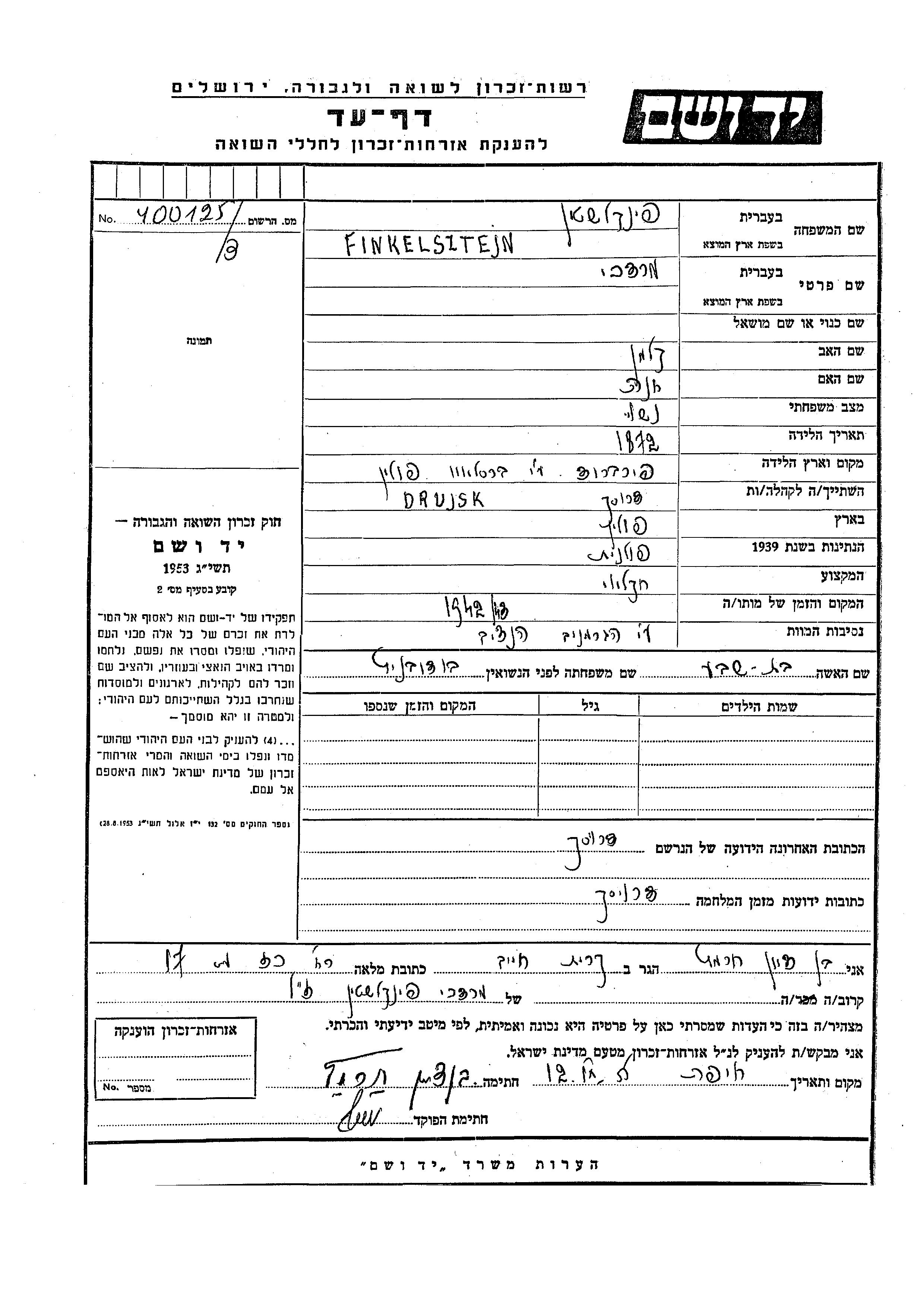 Mordekhai Finkelshtein wurde im Jahr 1870 in unbekannter Ort geboren. Er war Landwirt. Vor dem Zweiten Weltkrieg lebte er in Drujsk, Polen.