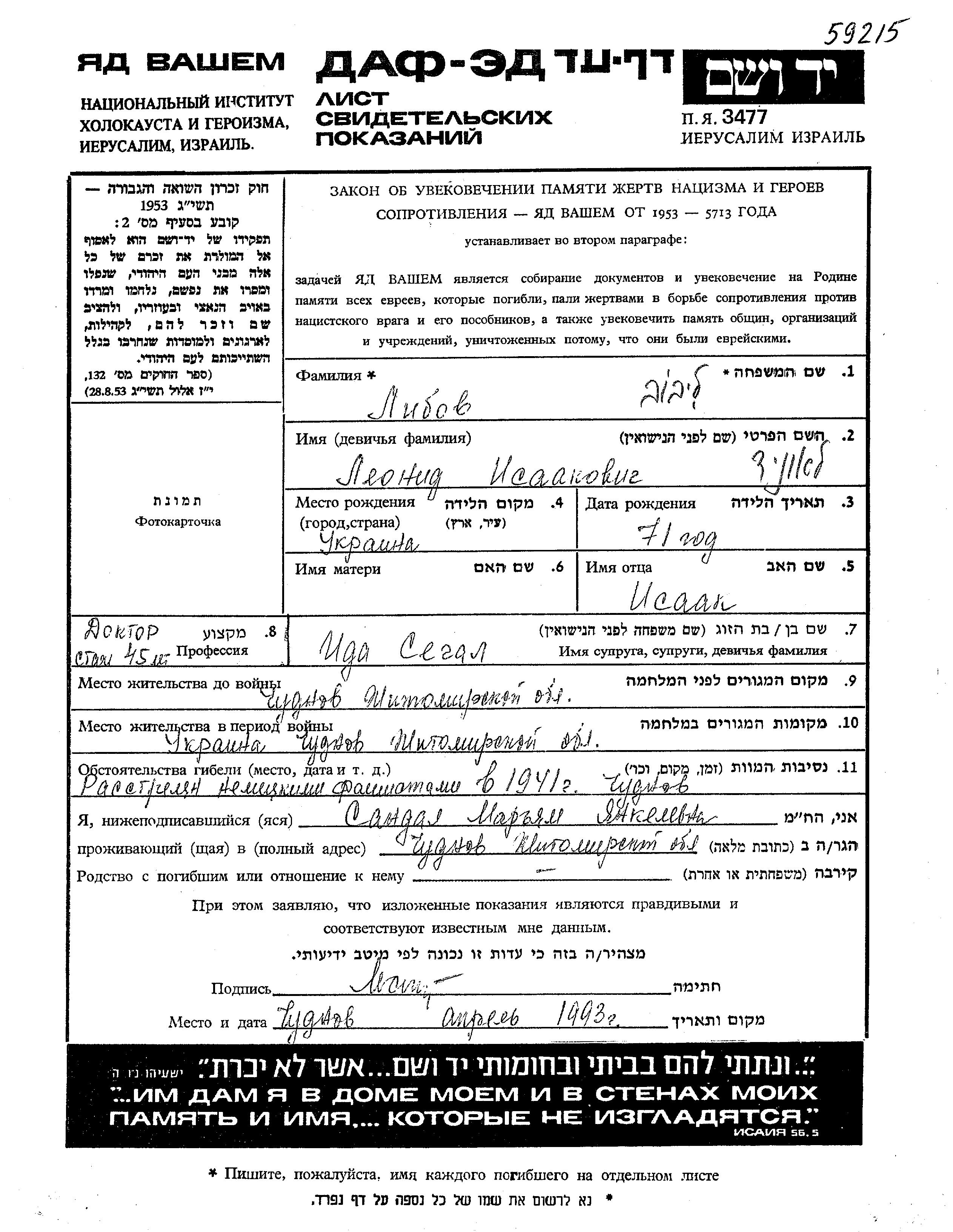 Leonid Libov wurde in Ukraine (UdSSR) geboren. Er war Arzt/ärztin. Vor dem Zweiten Weltkrieg lebte er in Chudnov, Ukraine (UdSSR).