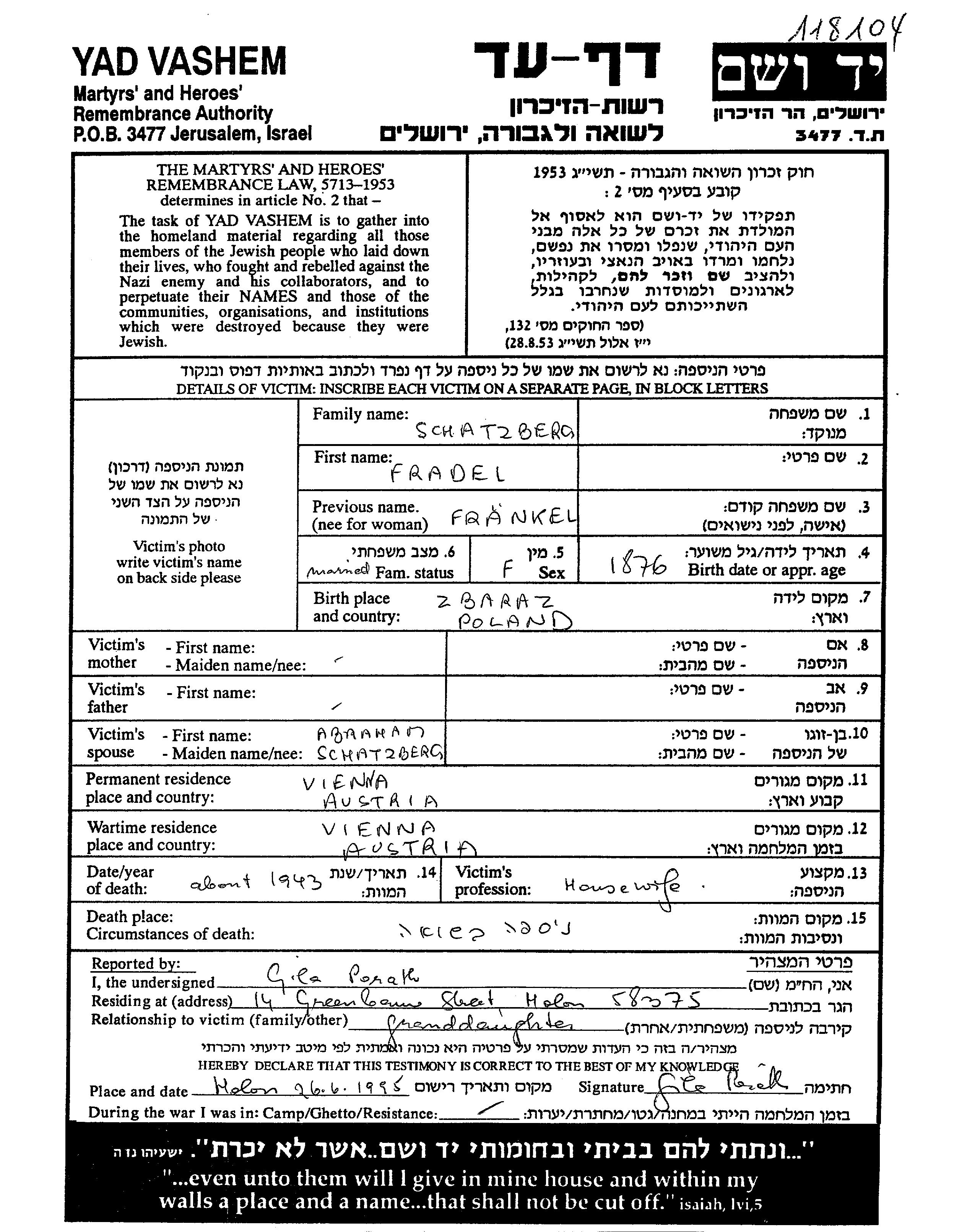 Schatzberg | Fradie | 1874 | Liste von ermordeten oesterreichischen Juden |