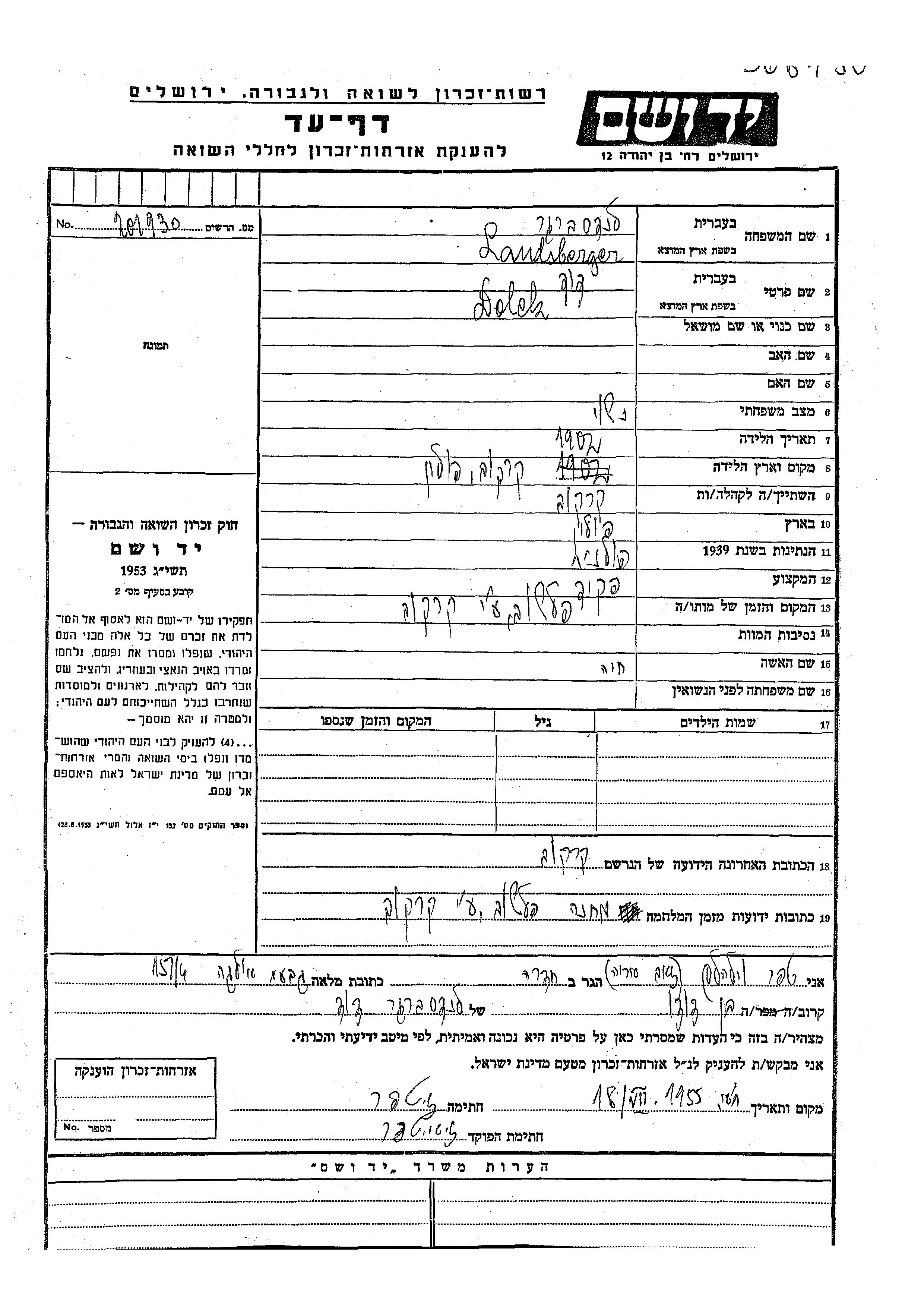 Dolek David Landsberger wurde im Jahr 1902 in Krakow, Polen geboren. Er war Angestellte/-r. Vor dem Zweiten Weltkrieg lebte er in Krakow, Polen. Während des Krieges war er in Flatow, Deutsches Reich.