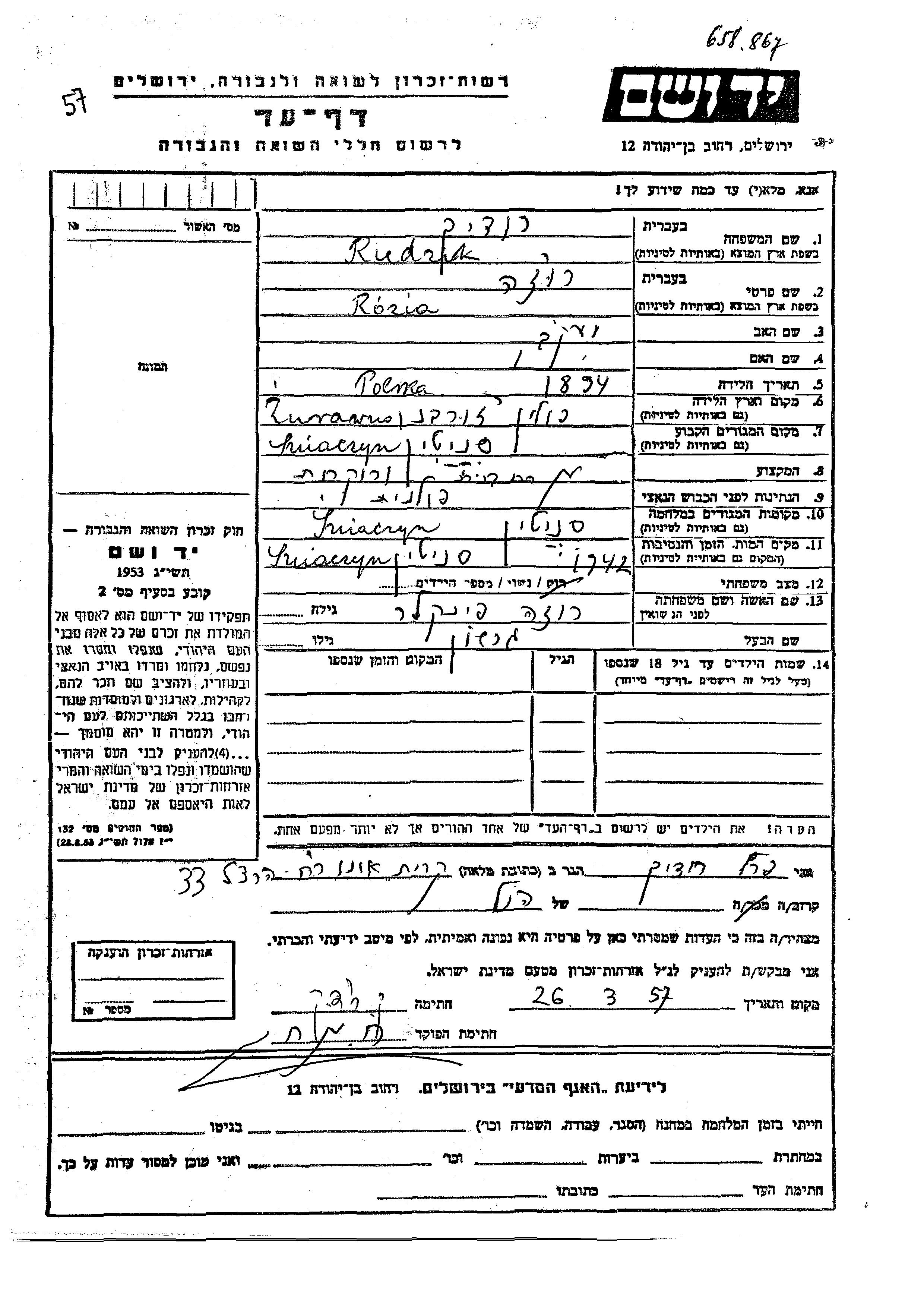 Roza Rudikh Rodik, geb. Finkler wurde im Jahr 1897 in Zurawno, Polen geboren. Sie war Apotheker/-in. Vor dem Zweiten Weltkrieg lebte sie in Sniatyn, Polen.