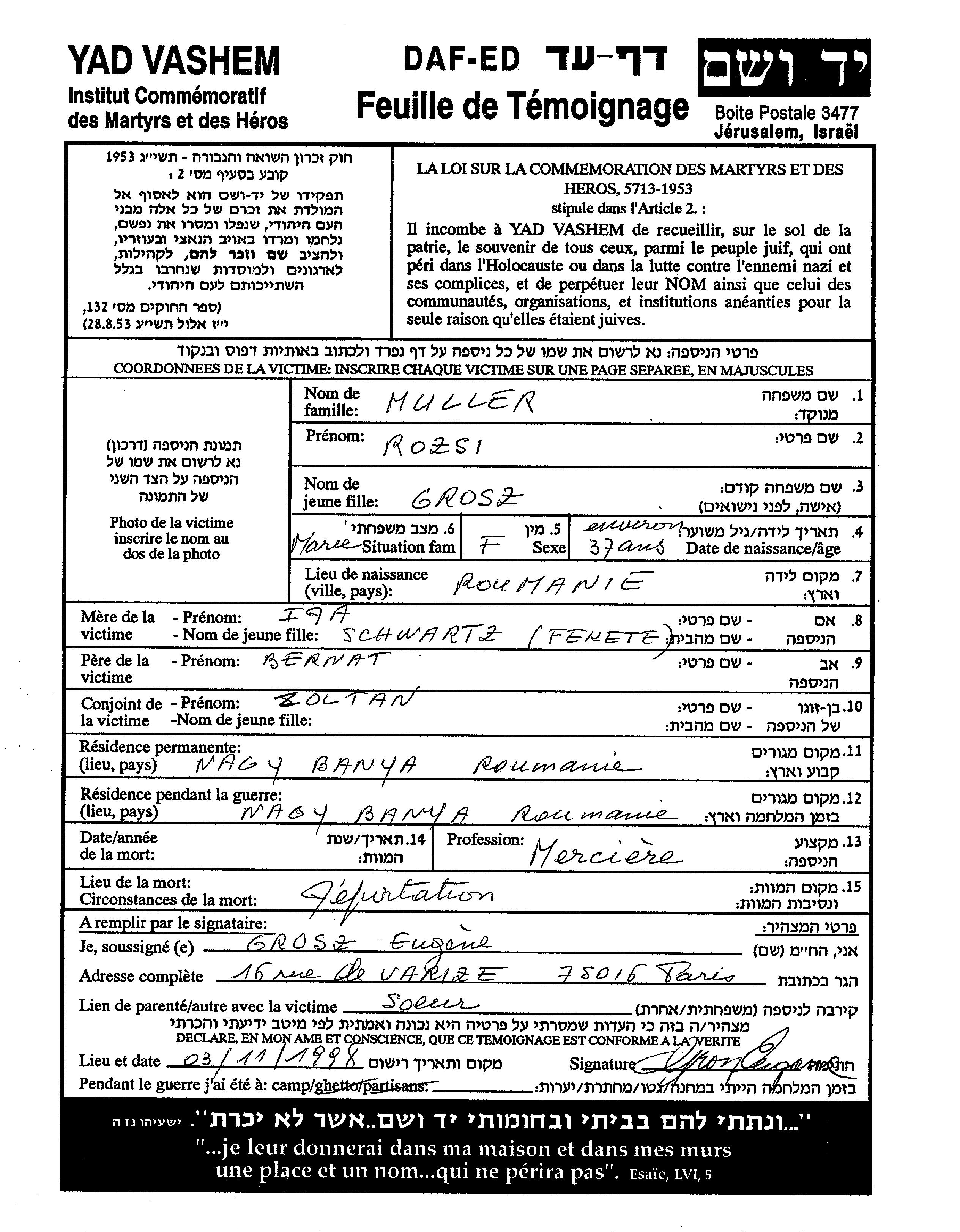 Rozsi Rachel Miler, geb. Gros wurde in Rumänien geboren. Sie war Merciere. Vor dem Zweiten Weltkrieg lebte sie in Nagy Banya, Rumänien.