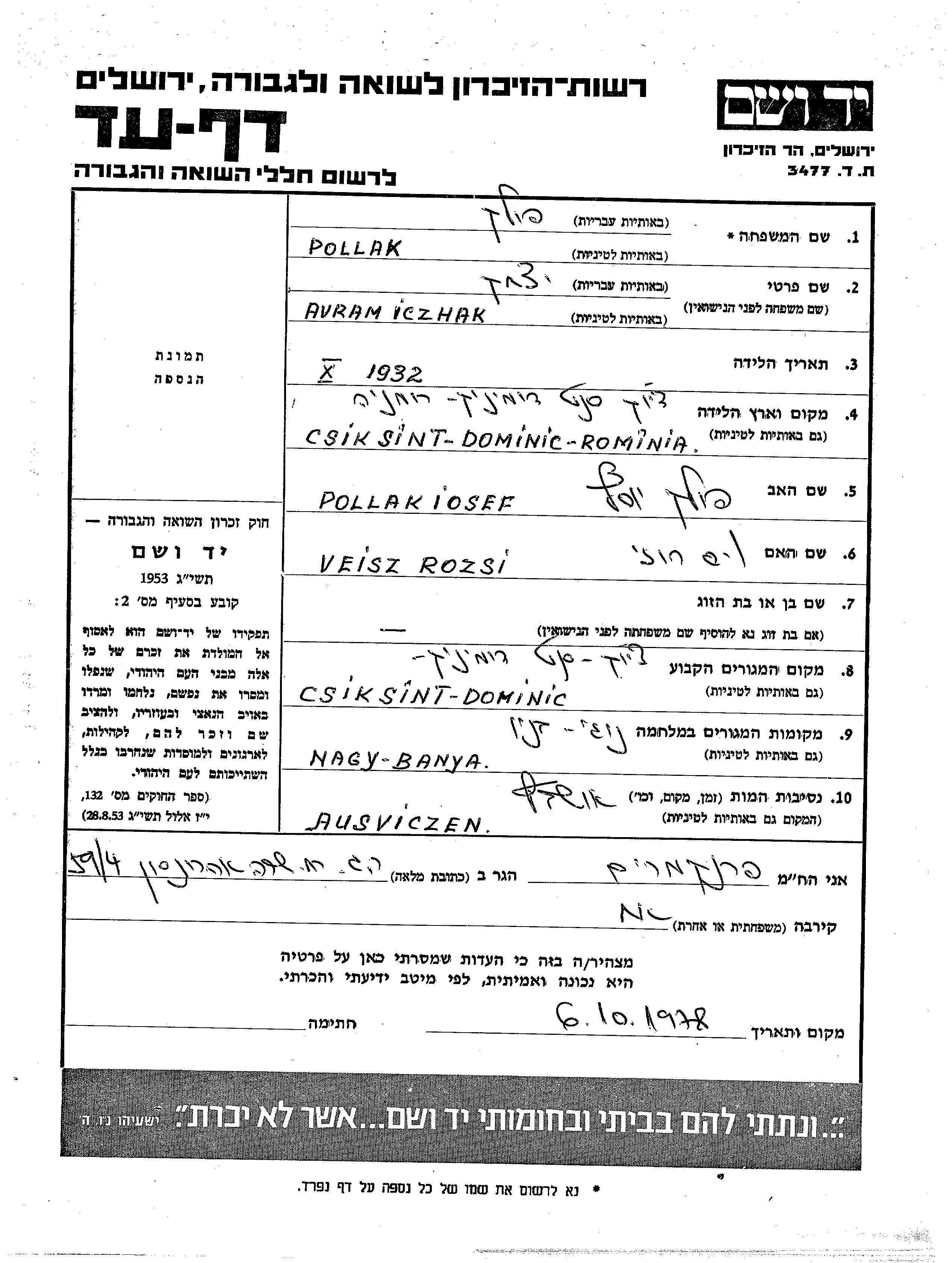 Pollak Avraham 1932 Nagybánya, Rumänien Gedenkblatt