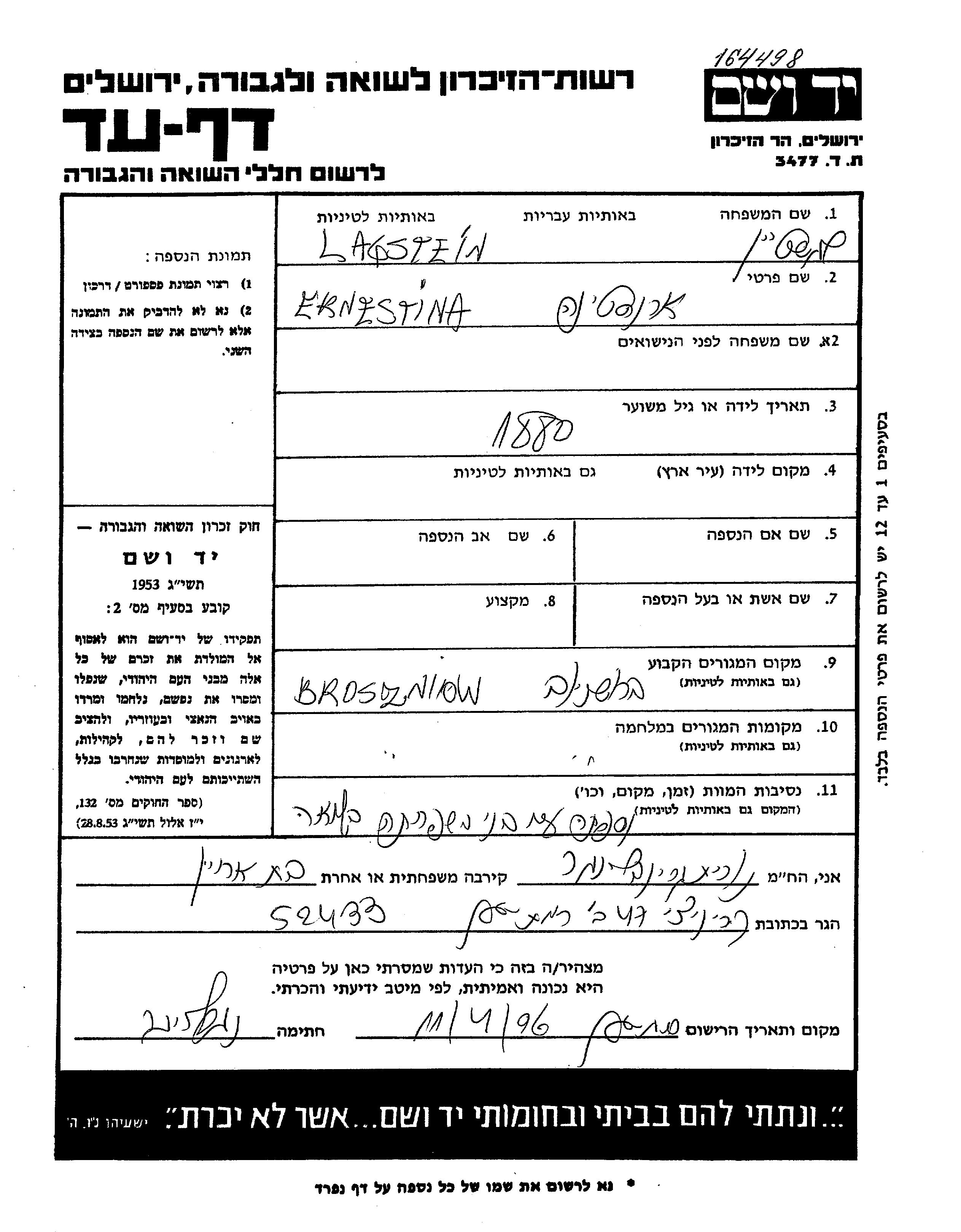 Ernestina Lagstein wurde im Jahr 1880 geboren. Sie war mit Haim Verheiratet. Vor dem Zweiten Weltkrieg lebte sie in Broszniow, Polen. Während des Krieges war sie in Broszniow, Polen.