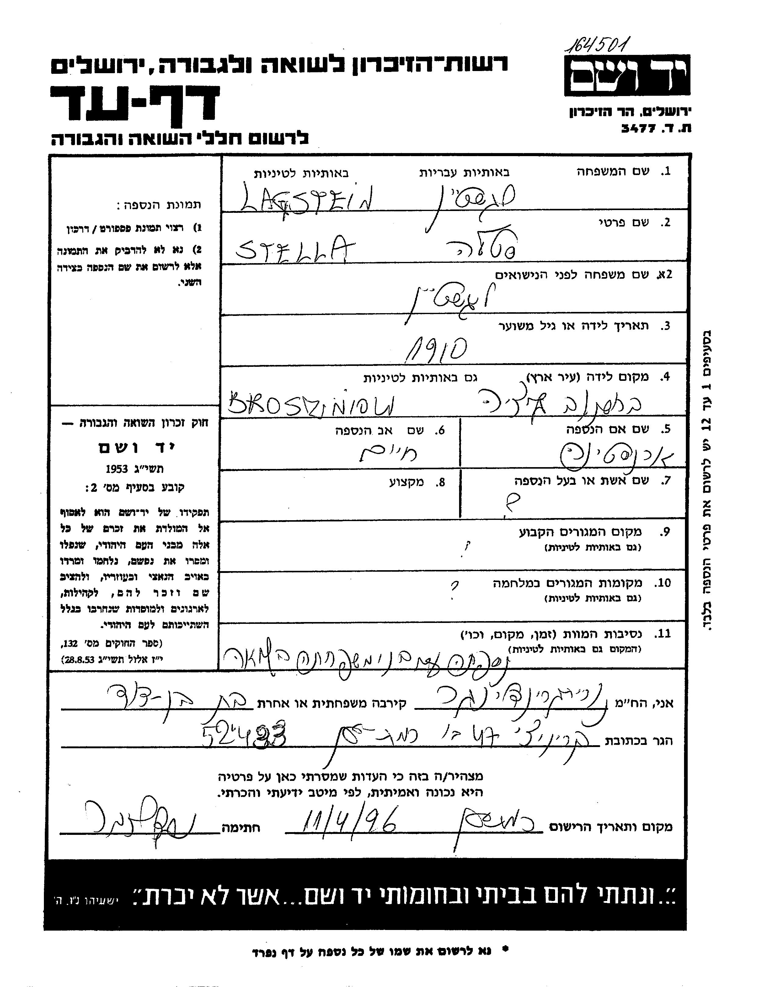 Stella Lagstein wurde im Jahr 1910 in Broszniow, Polen geboren. Sie war die Tochter von Haim und Ernestina.