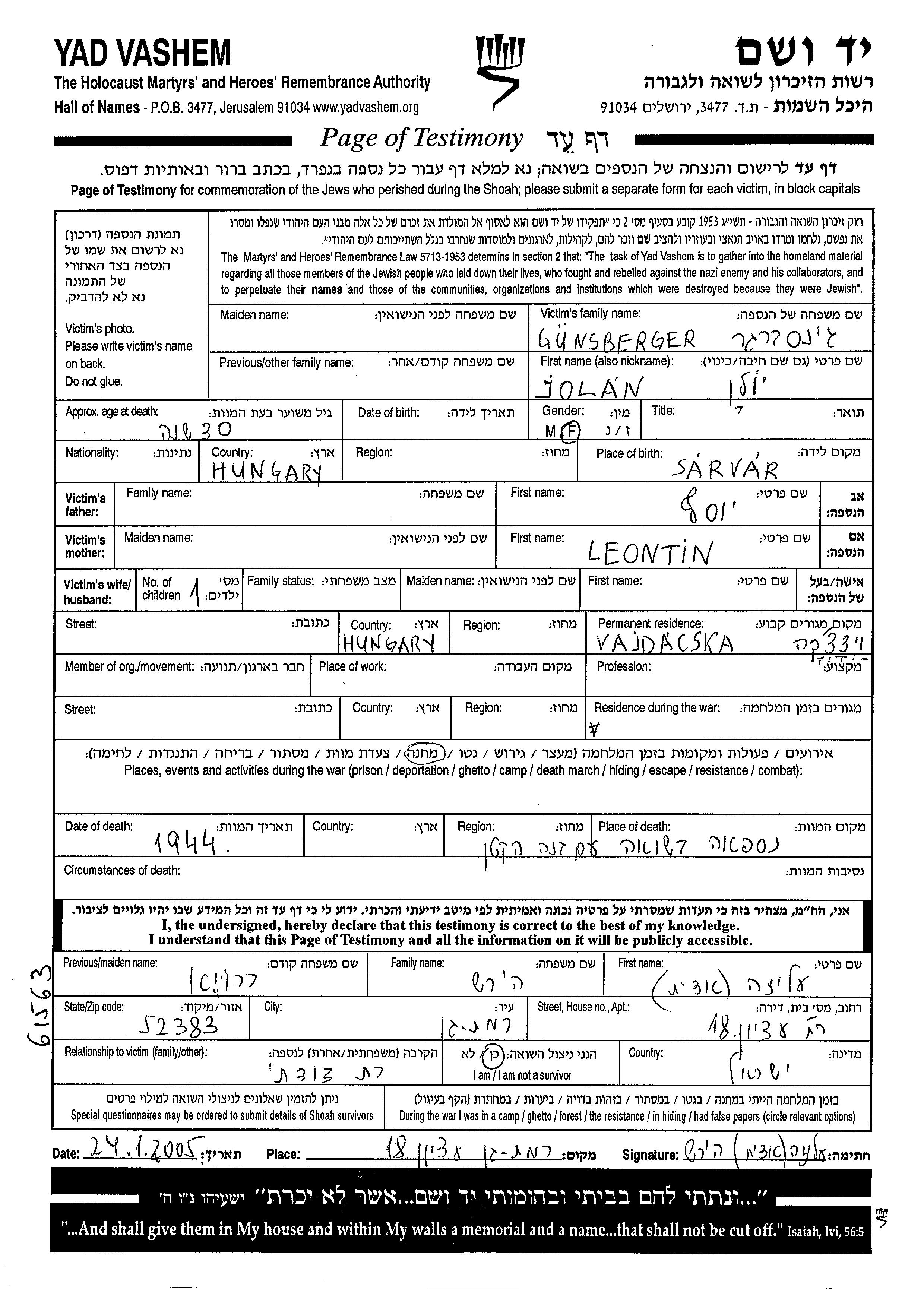 Ginsberger | Jolan | Vajdacska, Ungarn | Gedenkblatt | |