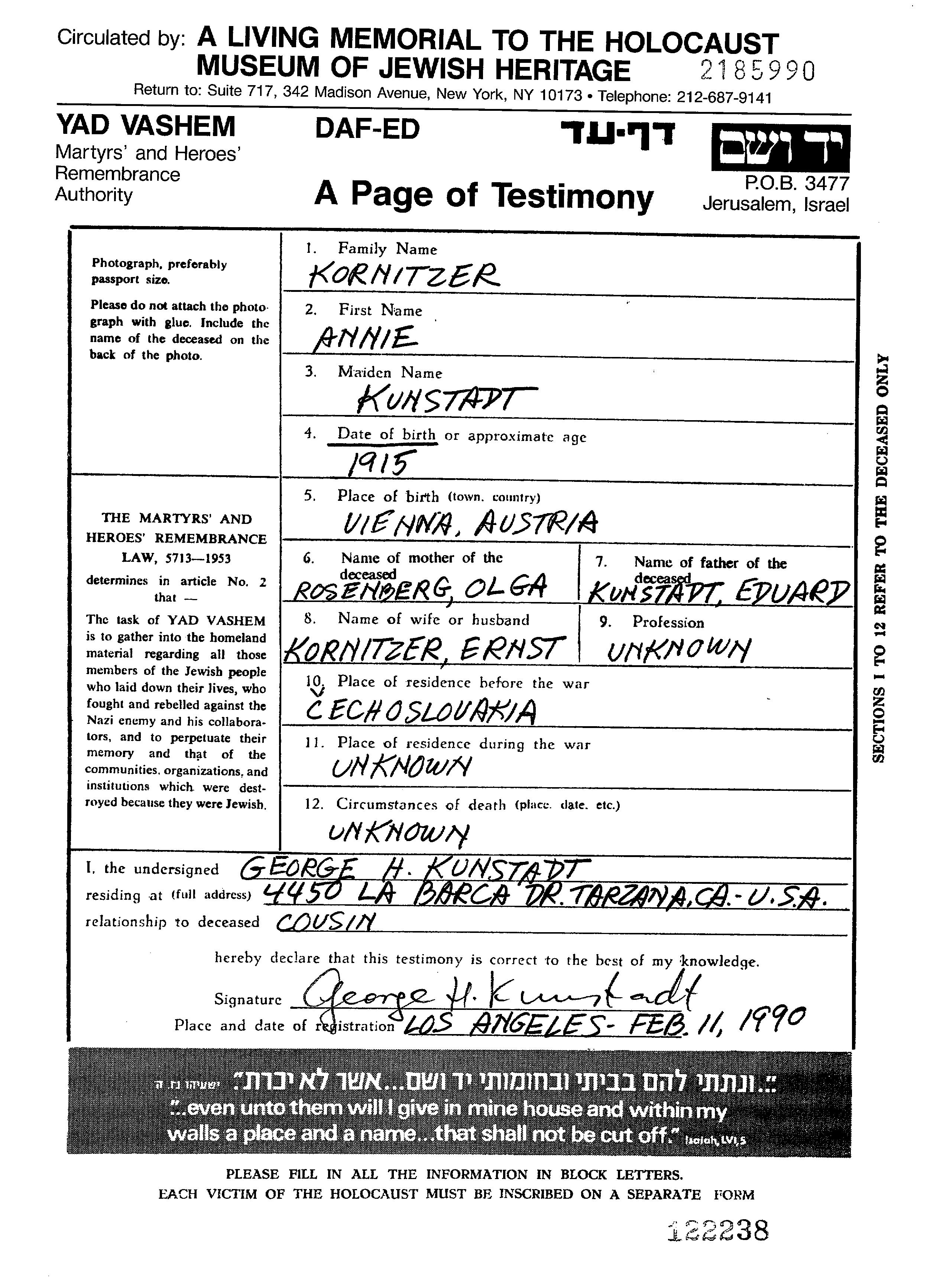 Kornitzer | Annie | 1915 | Tschechoslowakei | Gedenkblatt |