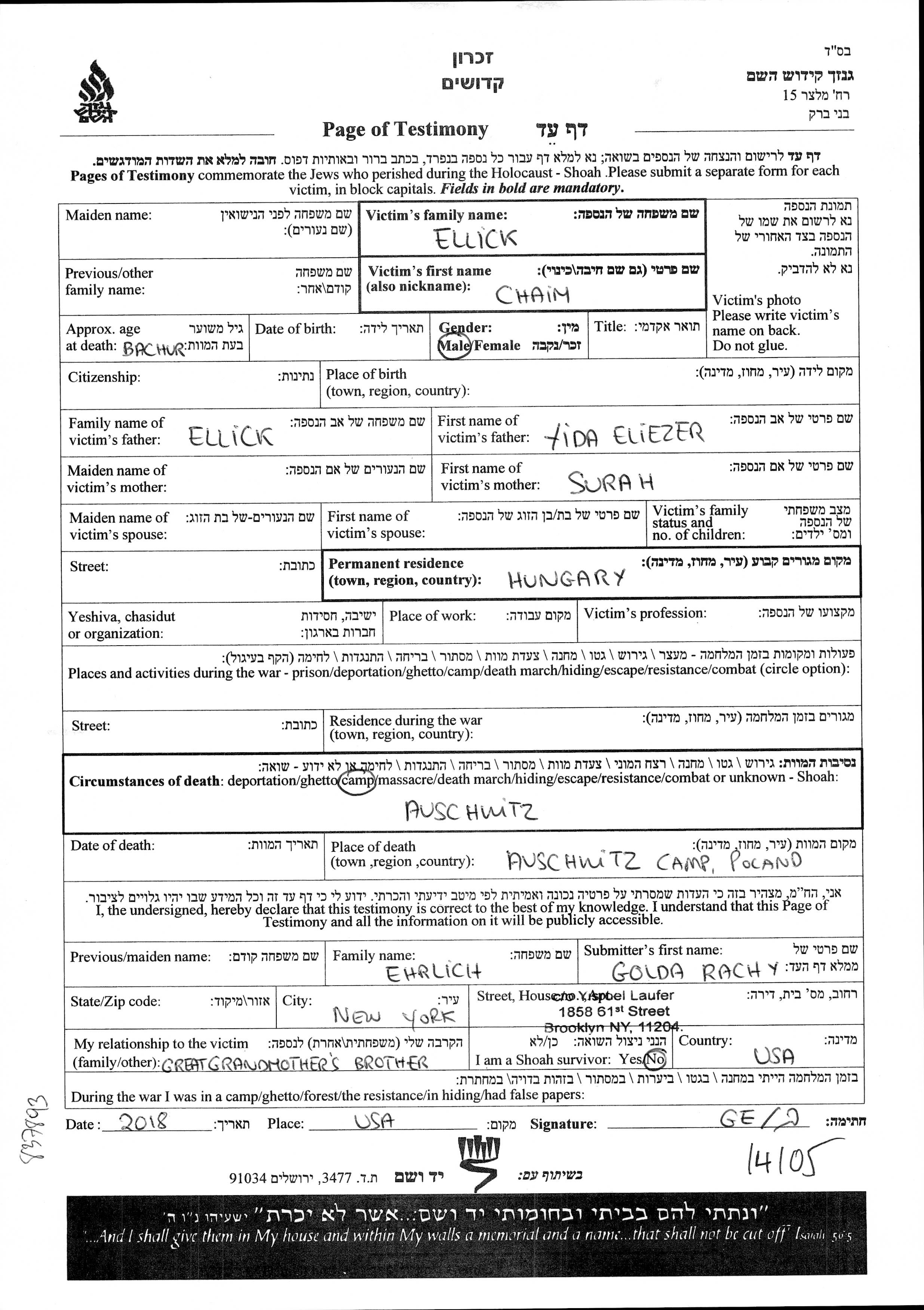 Chaim Ellick wurde in unbekannter Ort geboren. Vor dem Zweiten Weltkrieg lebte er in Ungarn.