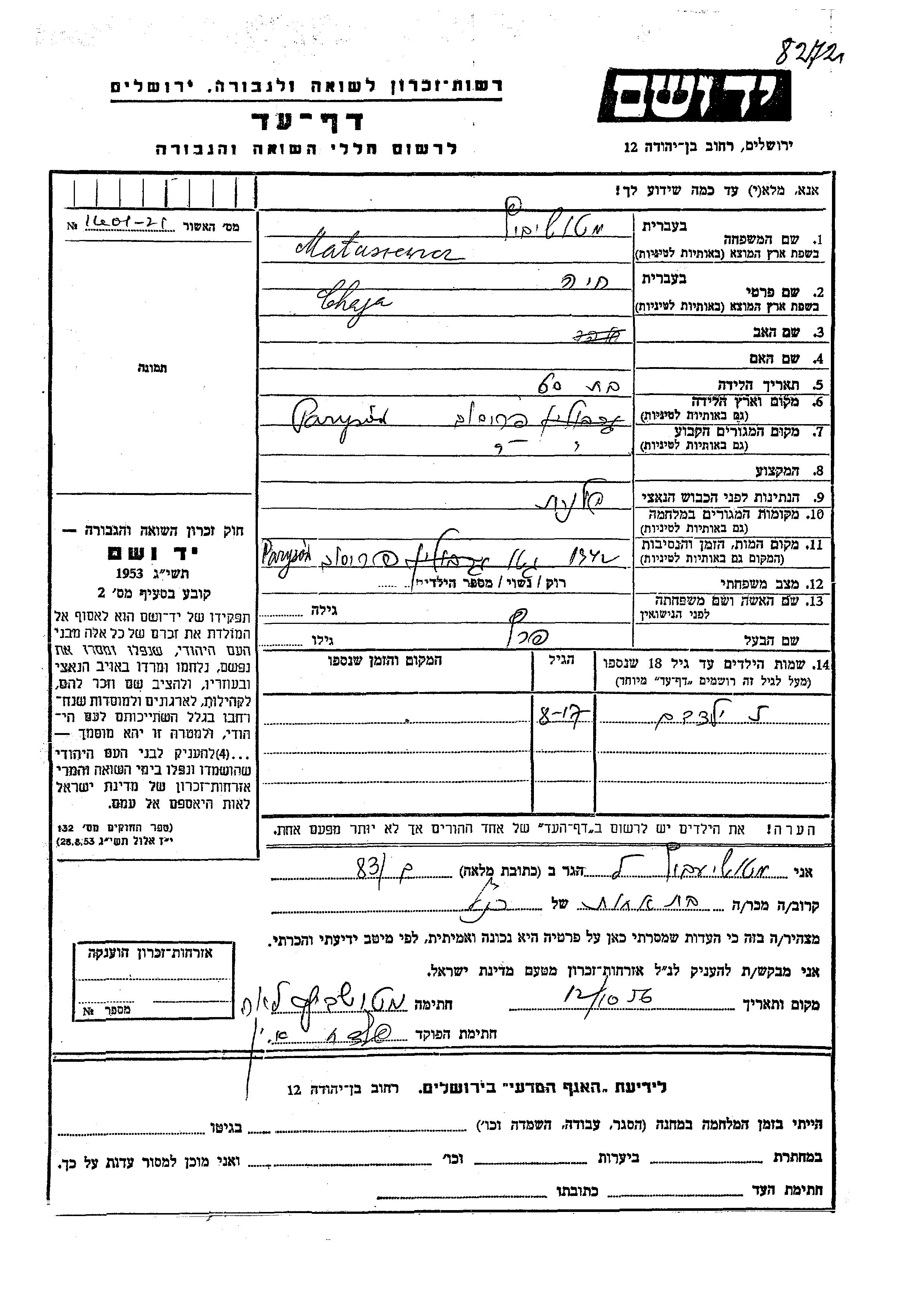 Chaja Matusiewicz wurde in Parysow, Polen geboren. Sie war mit Peretz Verheiratet. Vor dem Zweiten Weltkrieg lebte sie in Parysow, Polen.