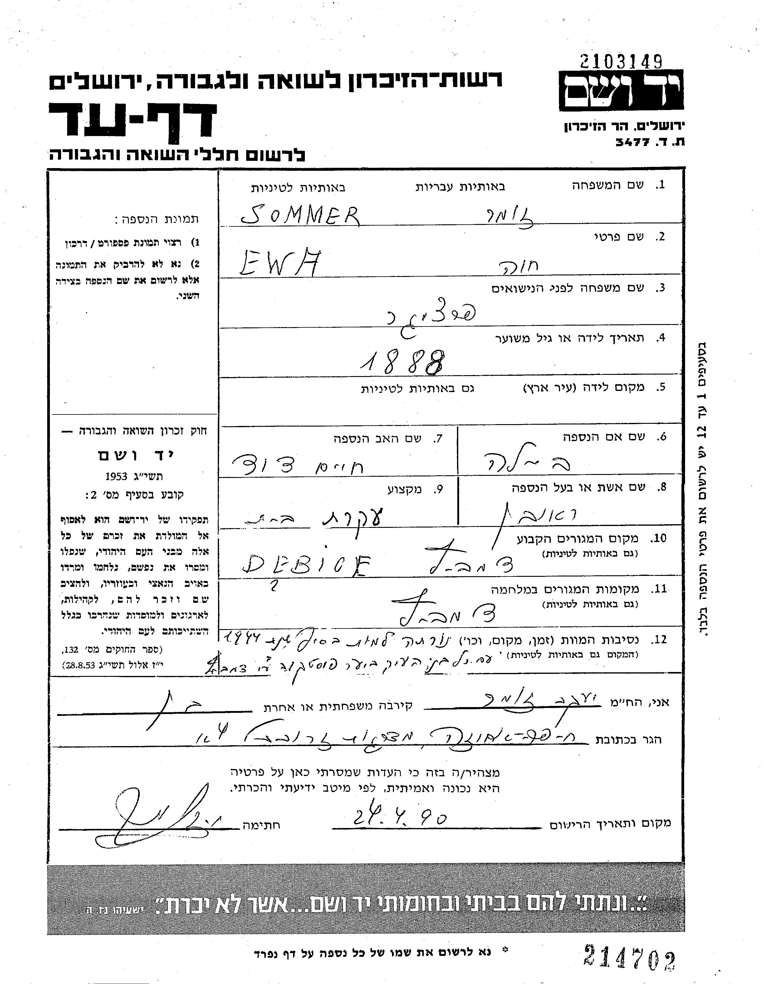 Ewa Chawa Sommer, geb. Prediger Fertziger wurde im Jahr 1880 in Debica, Polen geboren. Sie war Hausfrau. Vor dem Zweiten Weltkrieg lebte sie in Debica, Polen.
