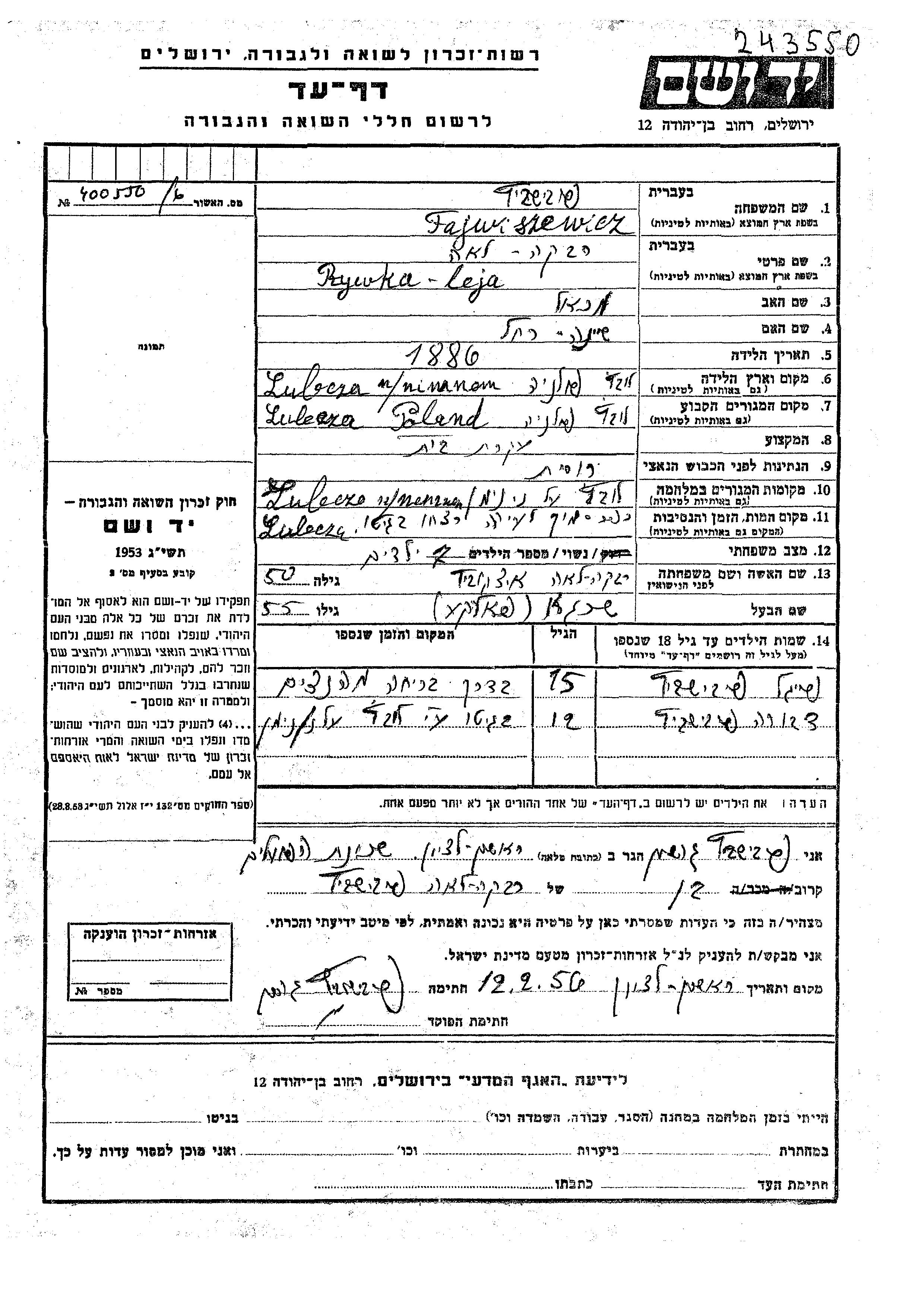 Rywka Leja Fajwiszewicz, geb. Itzkovitz wurde im Jahr 1886 in Lubcza, Polen geboren. Sie war die Tochter von Mekhael und Rakhel Sheina. Sie war Hausfrau und mit Shraga Falk Verheiratet. Vor dem Zweiten Weltkrieg lebte sie in Lubcza, Polen. Während des Krieges war sie in Lubcza, Polen.