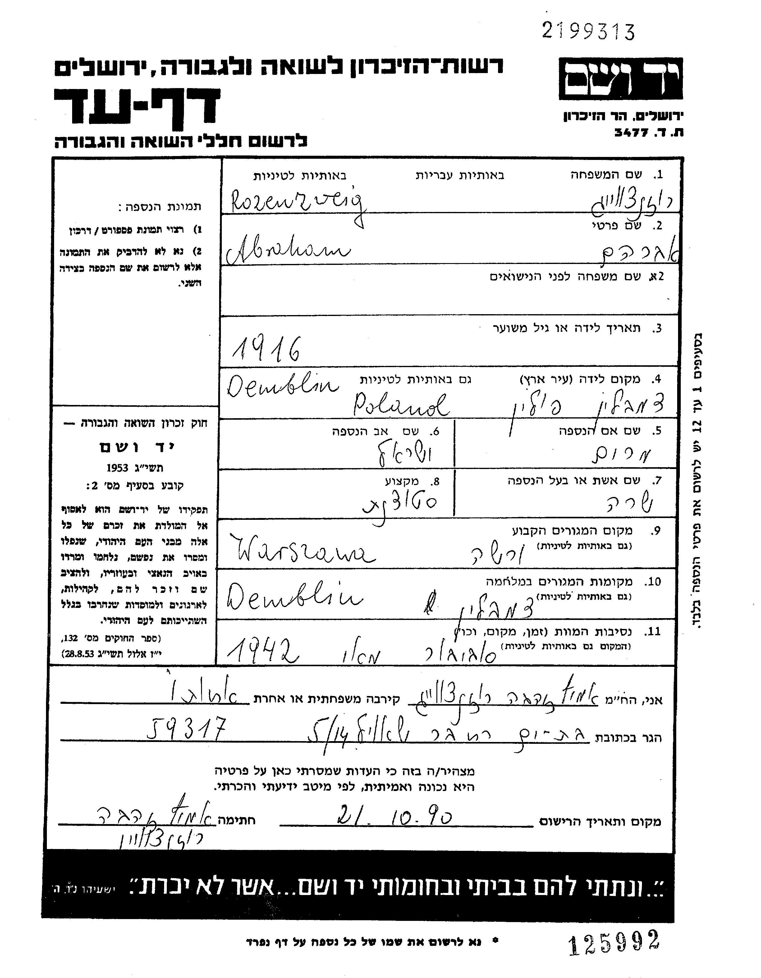 Abraham Rozenzweig wurde im Jahr 1916 in Deblin, Polen geboren. Er war Student. Vor dem Zweiten Weltkrieg lebte er in Warszawa, Polen.