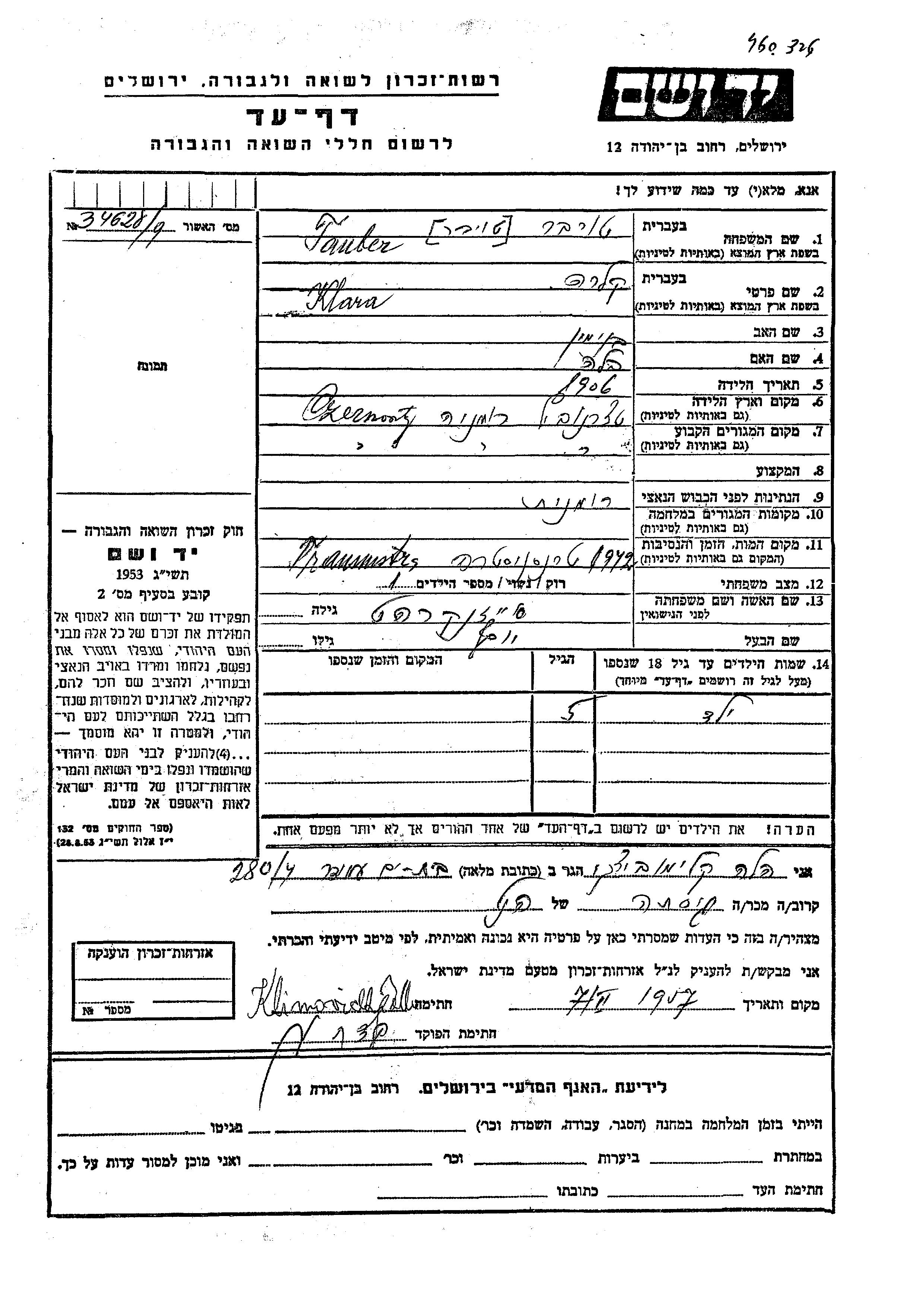 Tauber Klara 1906 Cernauti, Rumänien Gedenkblatt