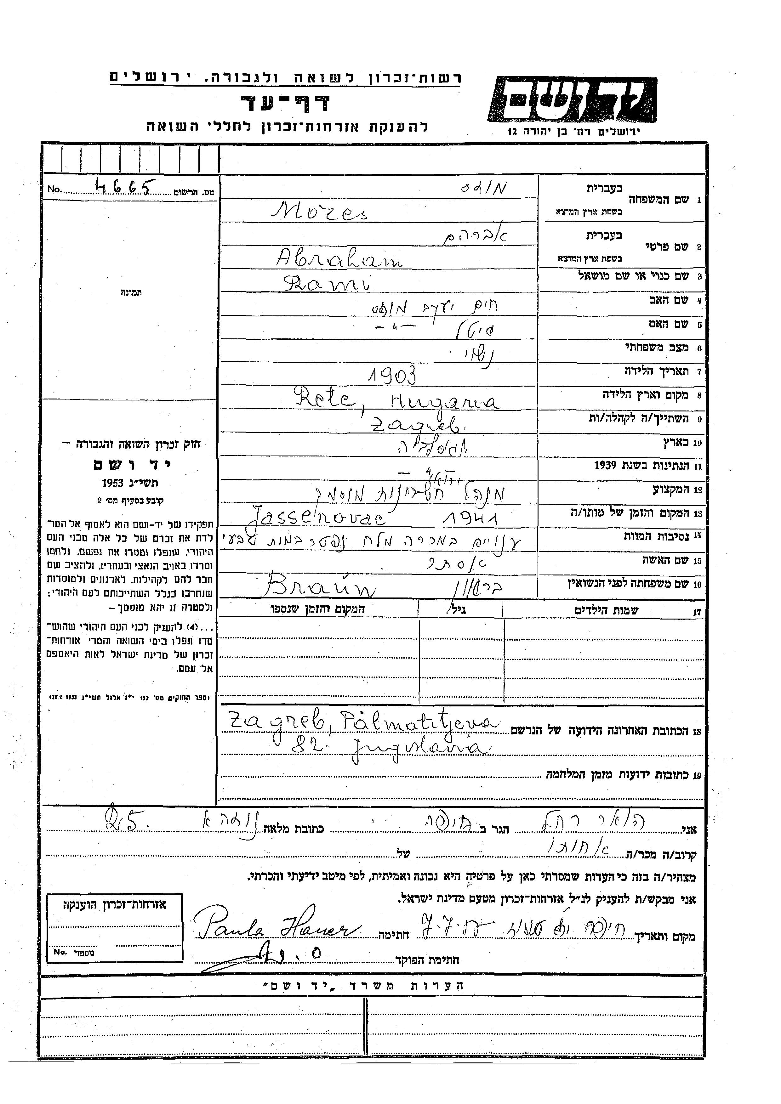 Abraham Mozes wurde im Jahr 1903 in Rete, Tschechoslowakei geboren. Er war der Sohn von Khaim Yaakov und Gitel. Er war Buchhalter/-in und mit Ester, geb. Braun Verheiratet. Vor dem Zweiten Weltkrieg lebte er in Zagreb, Jugoslawien. Während des Krieges war er in Zagreb, Jugoslawien.