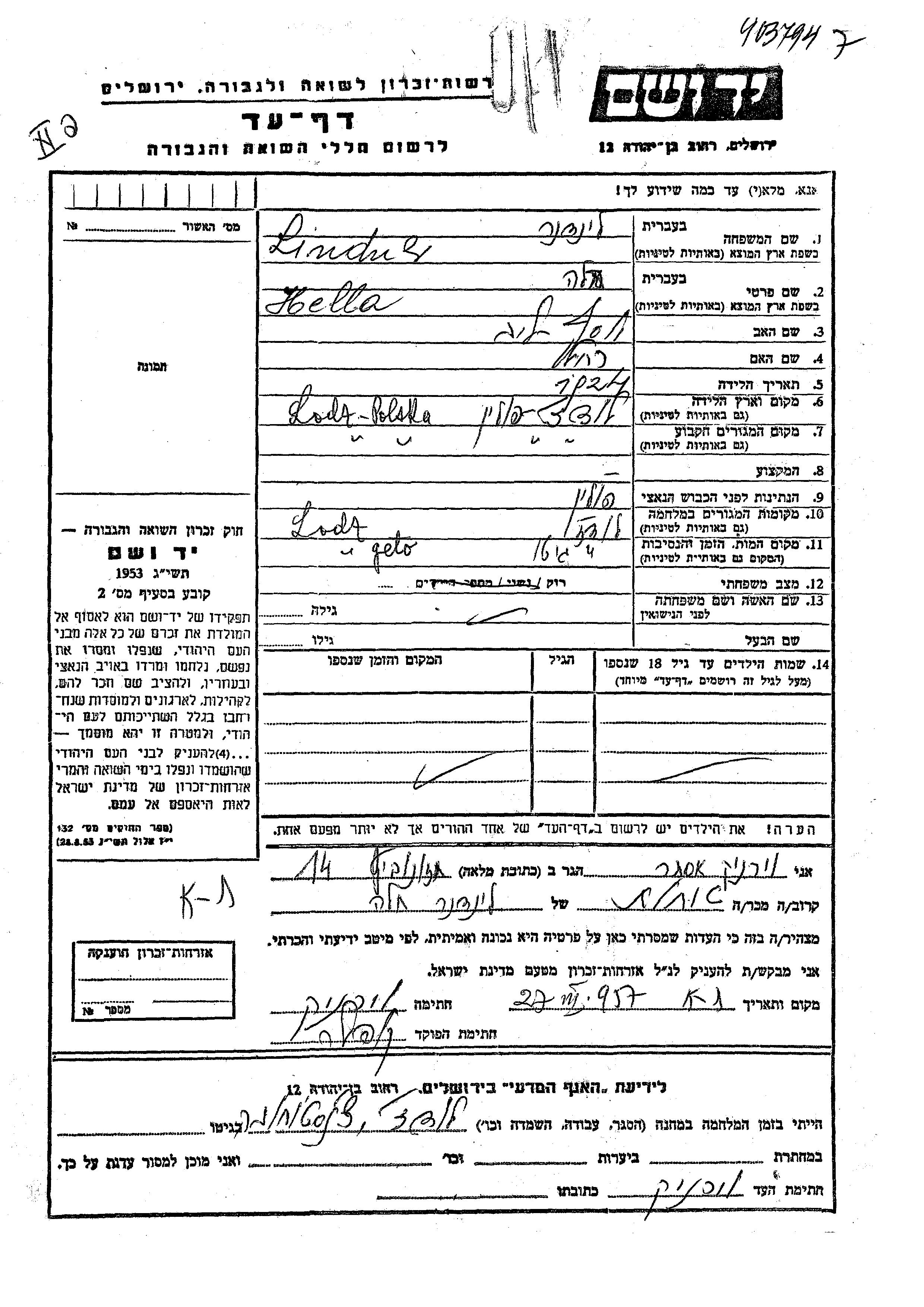 Hella Lindner wurde im Jahr 1924 in Lodz, Polen geboren. Sie war die Tochter von Yosef Leib und Rakhel. Sie war Ledig. Vor dem Zweiten Weltkrieg lebte sie in Lodz, Polen. Während des Krieges war sie in Lodz, Polen.